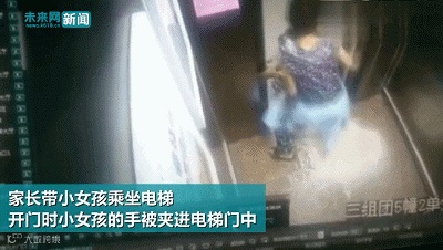 除了宠物,家长带小孩乘坐电梯时也要注意,一位妈妈带着女儿坐电梯,妈妈在玩手机,女儿在电梯里玩,手被即将打开的电梯给夹住了。
