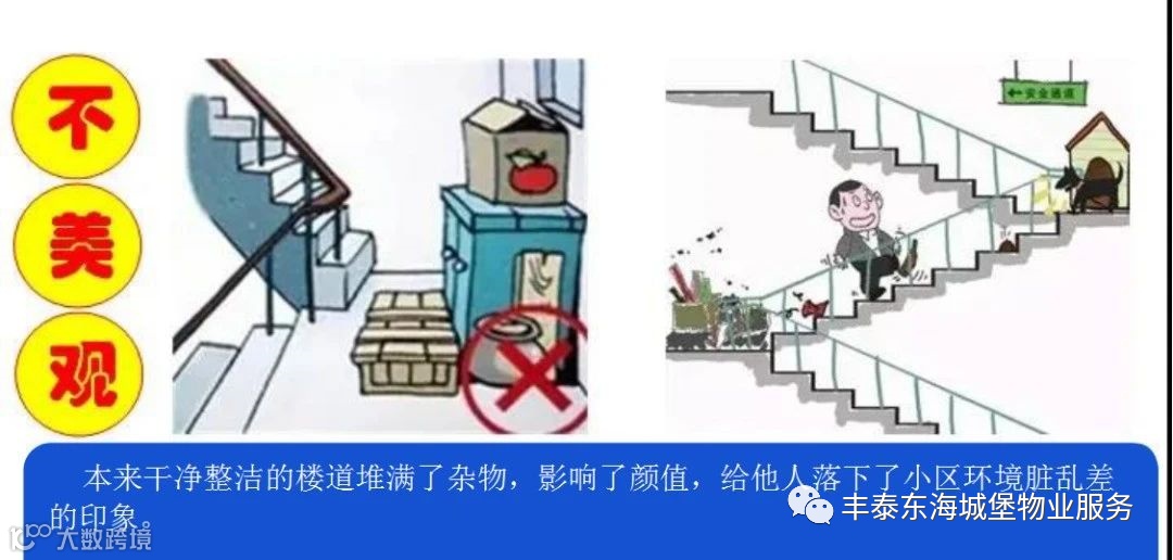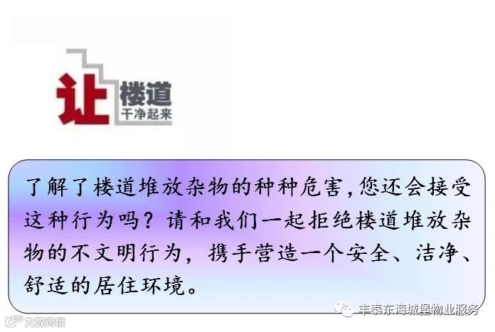 楼道堆放的物品杂物,是对他人合法权益的侵害;高空坠物,会带来意外伤害。一旦造成事故,物主将承担相应的法律责任。特此通知,请互相转告。