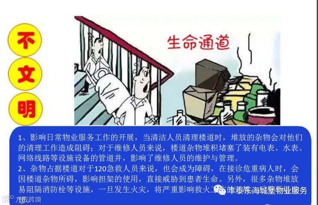 小区楼道是公共消防通道,将杂物堆放在楼道内,不仅影响日常通行还存在安全隐患。根据《消防法》相关规定:“任何单位、个人不得占用、堵塞、封闭疏散通道、安全出口、消防车通道”。为保障业主居住安全及公共秩序,让我们一起拒绝堵塞楼道的不文明行为。