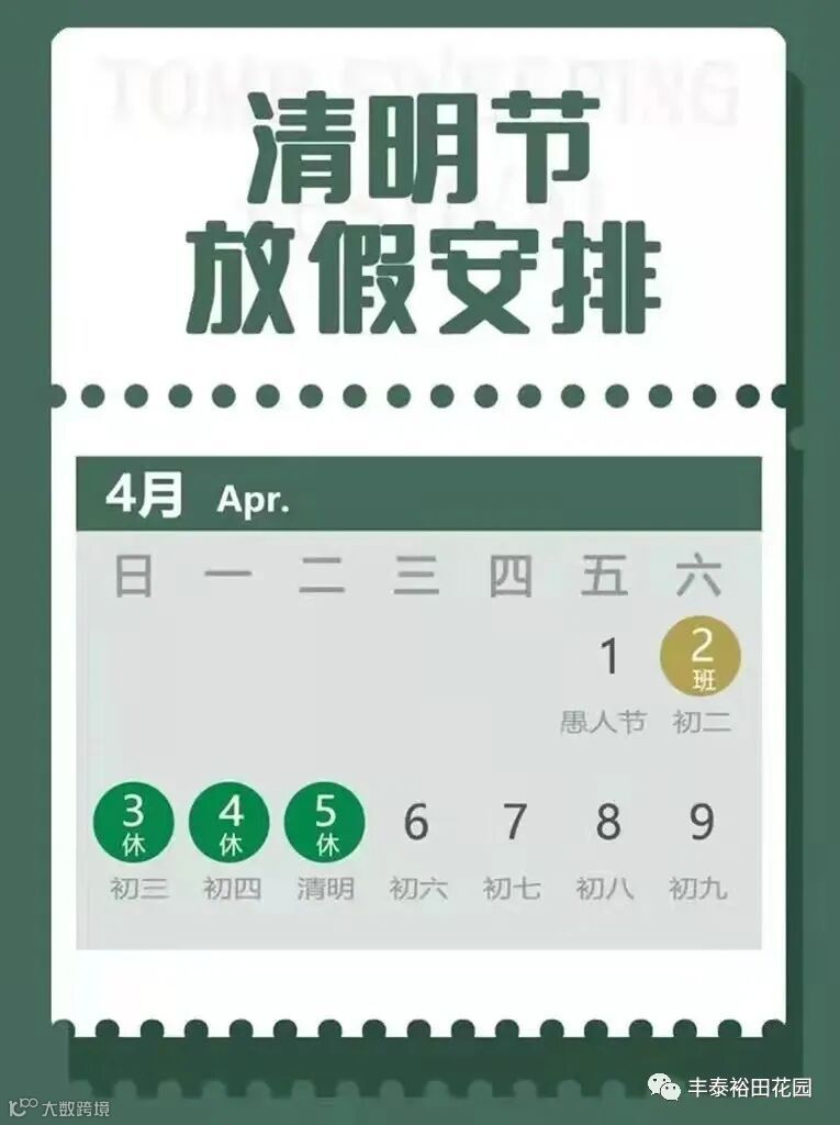 4月3日(星期日)至5日(星期二)放假调休,共3天。