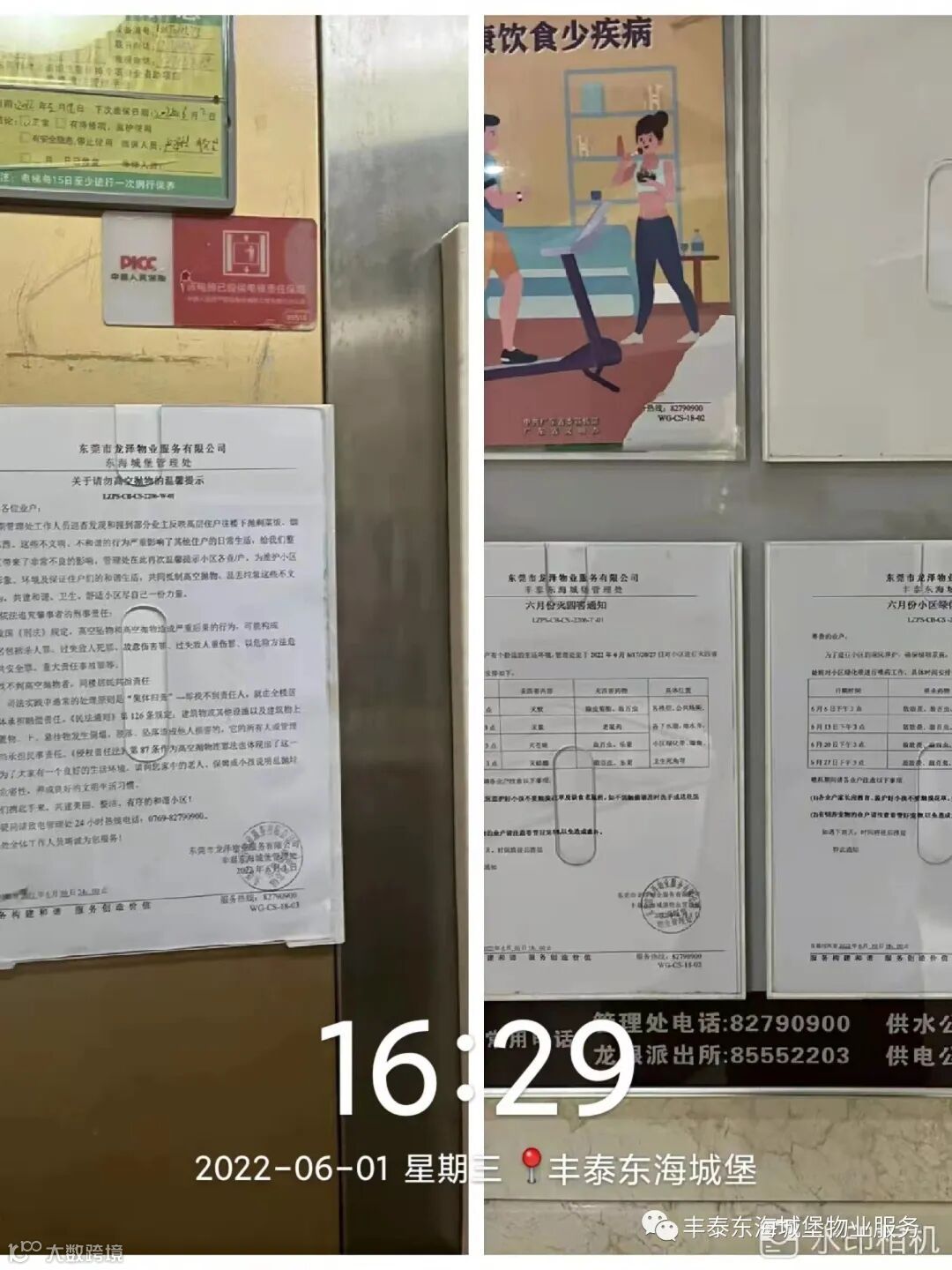 3.区域管家放置消杀通知及电梯高空抛物温馨提示。