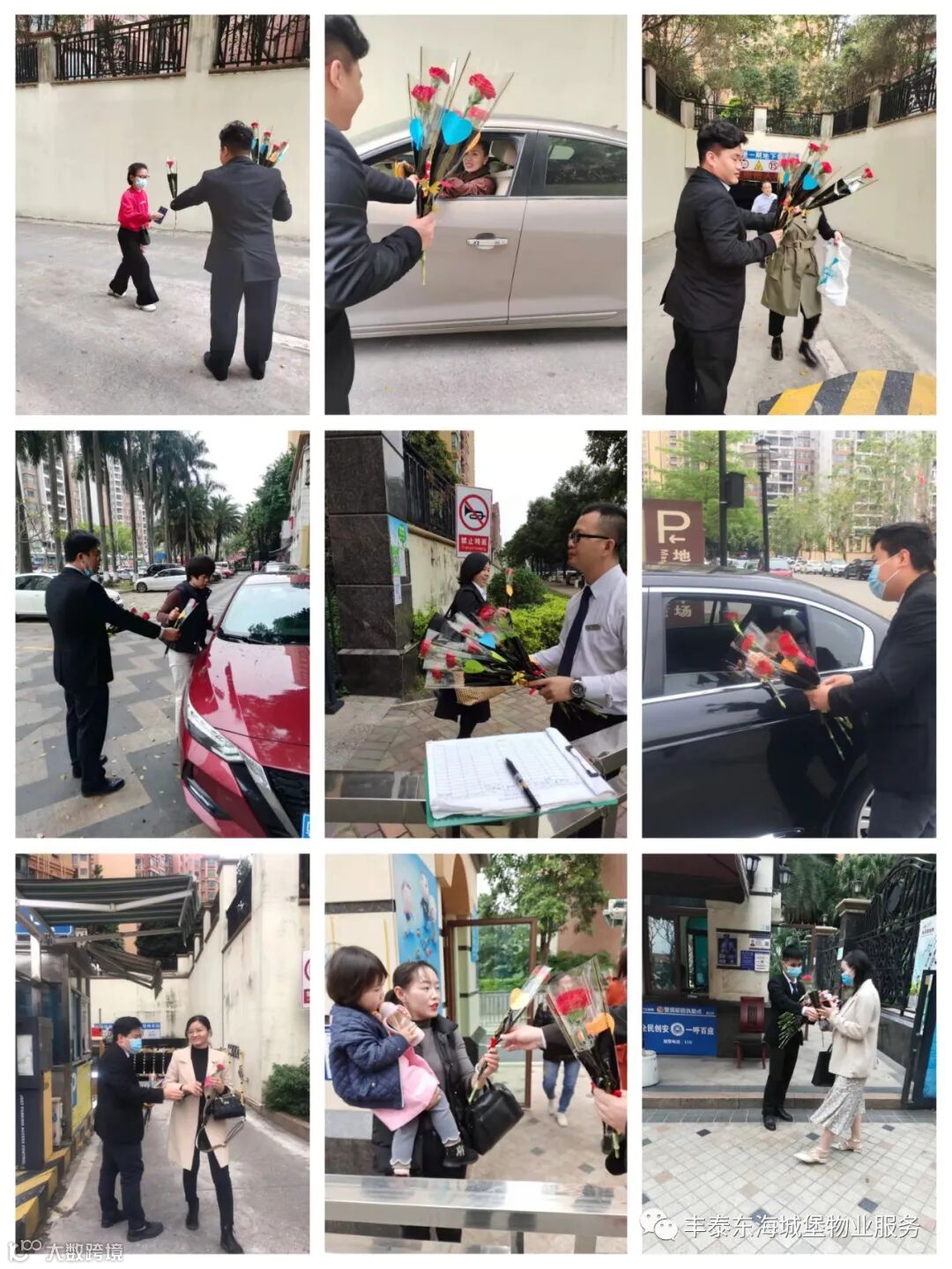 客户服务中心同事们依托小区各出入口,给进出小区、散步的的女神们献上鲜花和节日问候,盛开的鲜花和灿烂的笑脸交相辉映,映衬出最美暖心的节日氛围