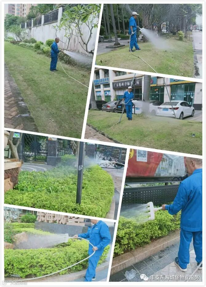 3.小区外围绿化草被浇水。