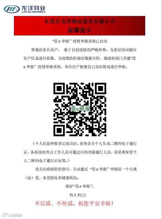 请关注政府防控指引,主动通过"莞e申报"申报近一个月离(返)莞、来莞情况和健康状况。