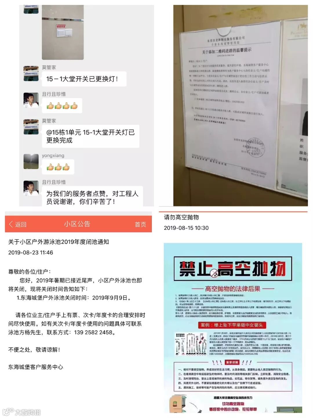 以上只是我们日常物业工作一部分,为业主/住户朋友提供一个安全/舒适/温馨的居住环境,我们物业人一直在努力,也是我们工作的目标。同时,也希望广大业主/住户能支持客户服务中心,对我们物业工作多一份包容与理解。让我们一起共建美好小区居住环境。