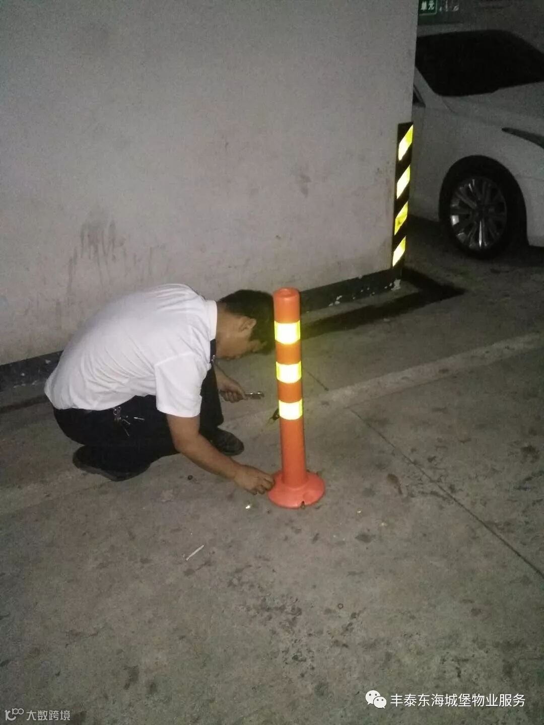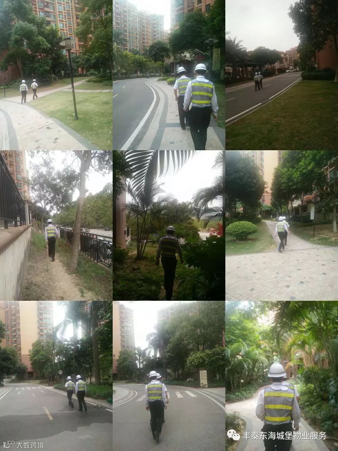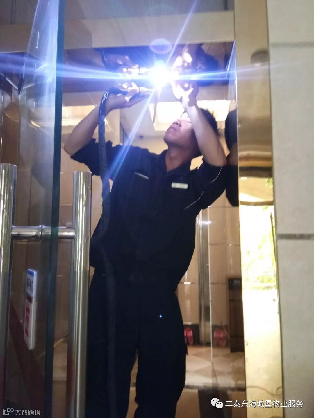 ▲夜间秩序队员对小区楼道、外围、各岗亭值班情况进行巡查▲