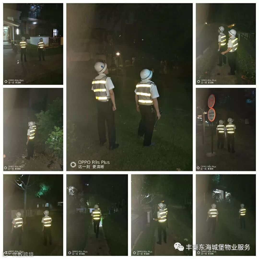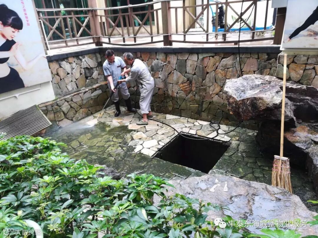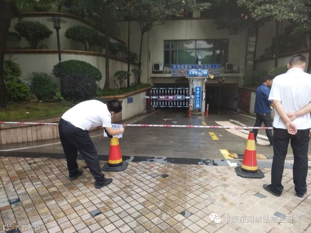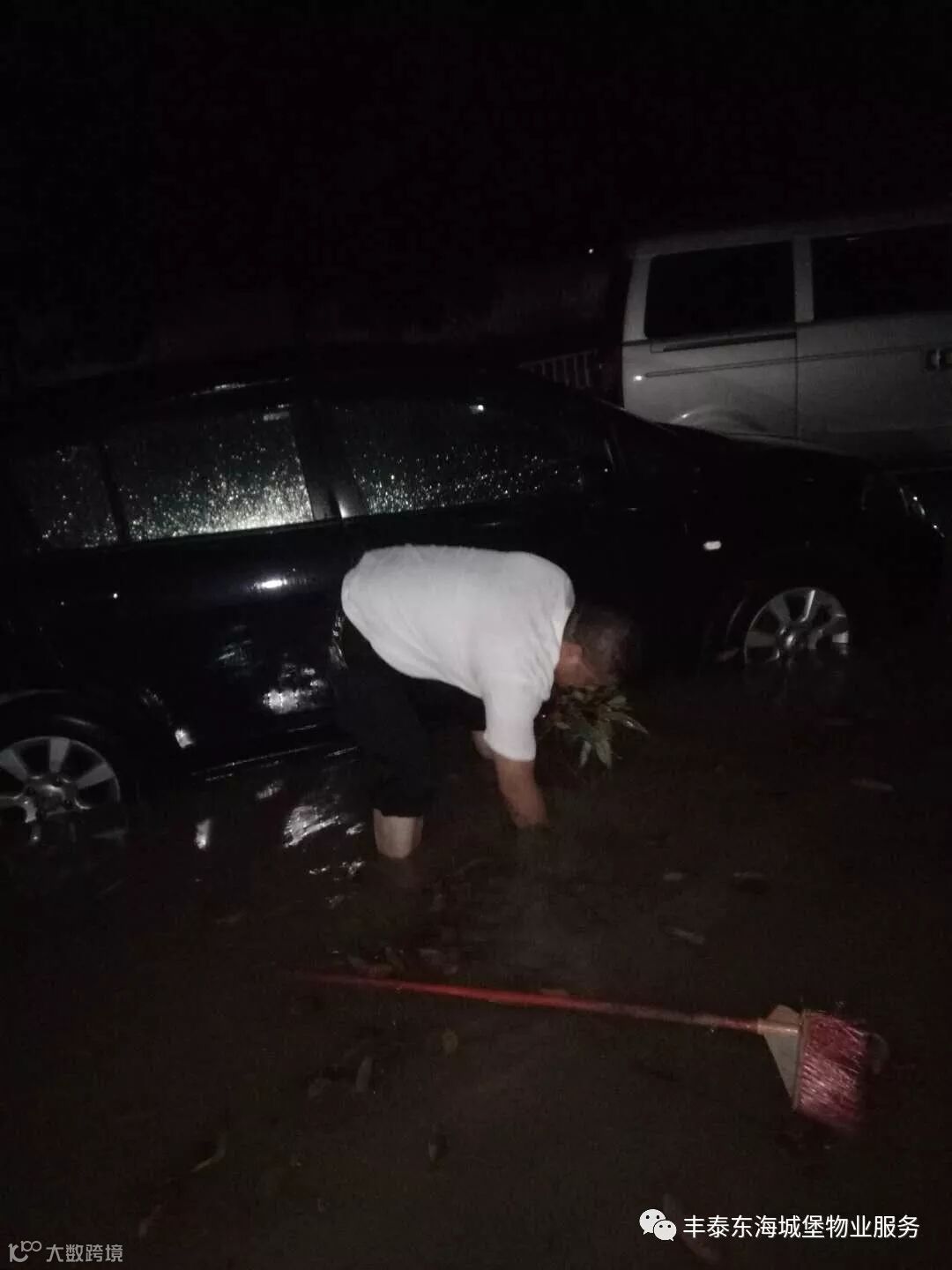 ▲大暴雨导致后门马路水浸,夜班队员现场疏通下水道▲