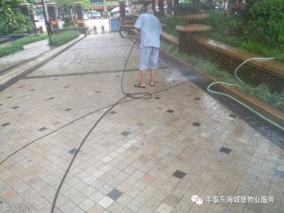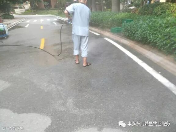▲对小区大门口主干道进行冲洗▲