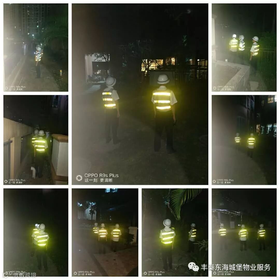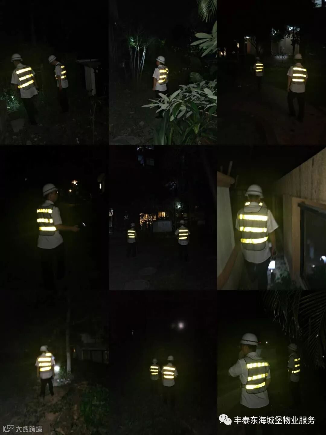 ▲夜间秩序队员对小区周边车库加强巡查▲