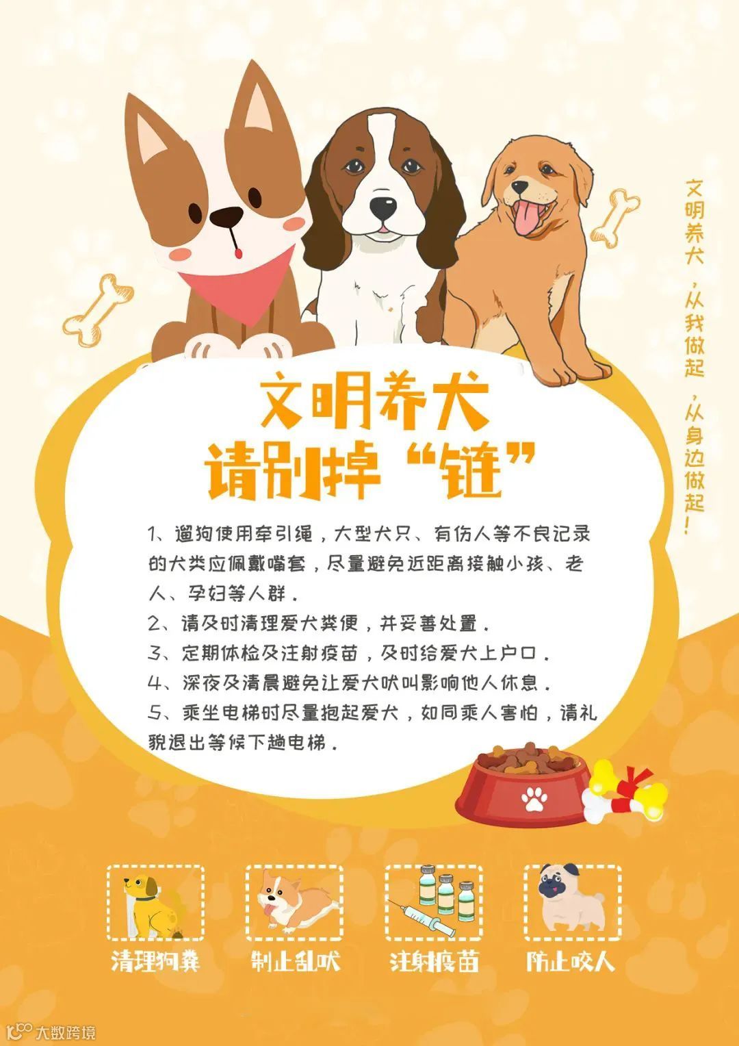 3、安全养宠:外出遛宠物时请为宠物戴上宠物链、嘴套等,避免伤人、走失、打斗、中毒等种种意外;在家饲养宠物期间请小心看护管理,关好家中大门避免宠物自行外出;
