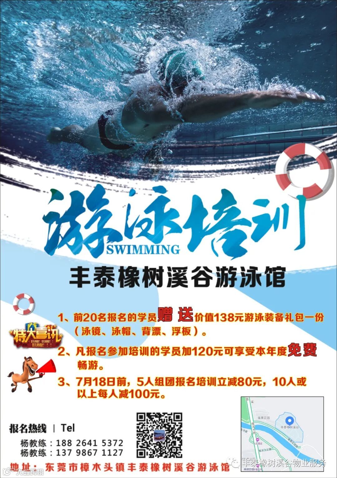 另:游泳池夏季游泳优惠活动及培训班招生咨询:杨教练:18826415372;