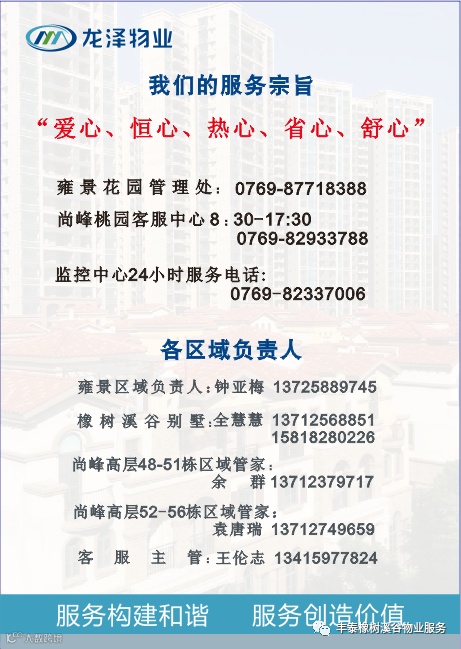 如需帮助,请致电物业服务中心24小时服务热线0769-82337006,或联系您的区域管家,感谢您对物业工作的支持与理解!