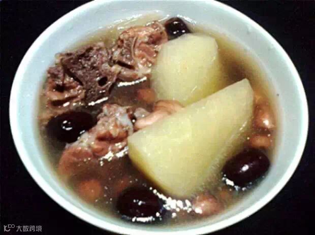 材料:沙葛500克、猪扇骨500克、眉豆50克、赤小豆50克、扁豆50克、蜜枣2个、姜2片。