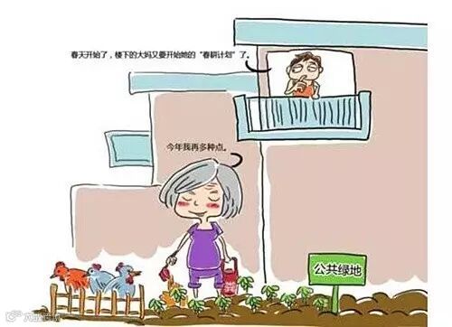 公共绿地属于全体业主所有,有的业主私自占用绿地种菜,园区绿地遭受破坏,这些行为严重影响园区美观。公共区域是全体业主共有的,绿地是造福全体业主的,任何人不得侵害全体业主的公共利益。