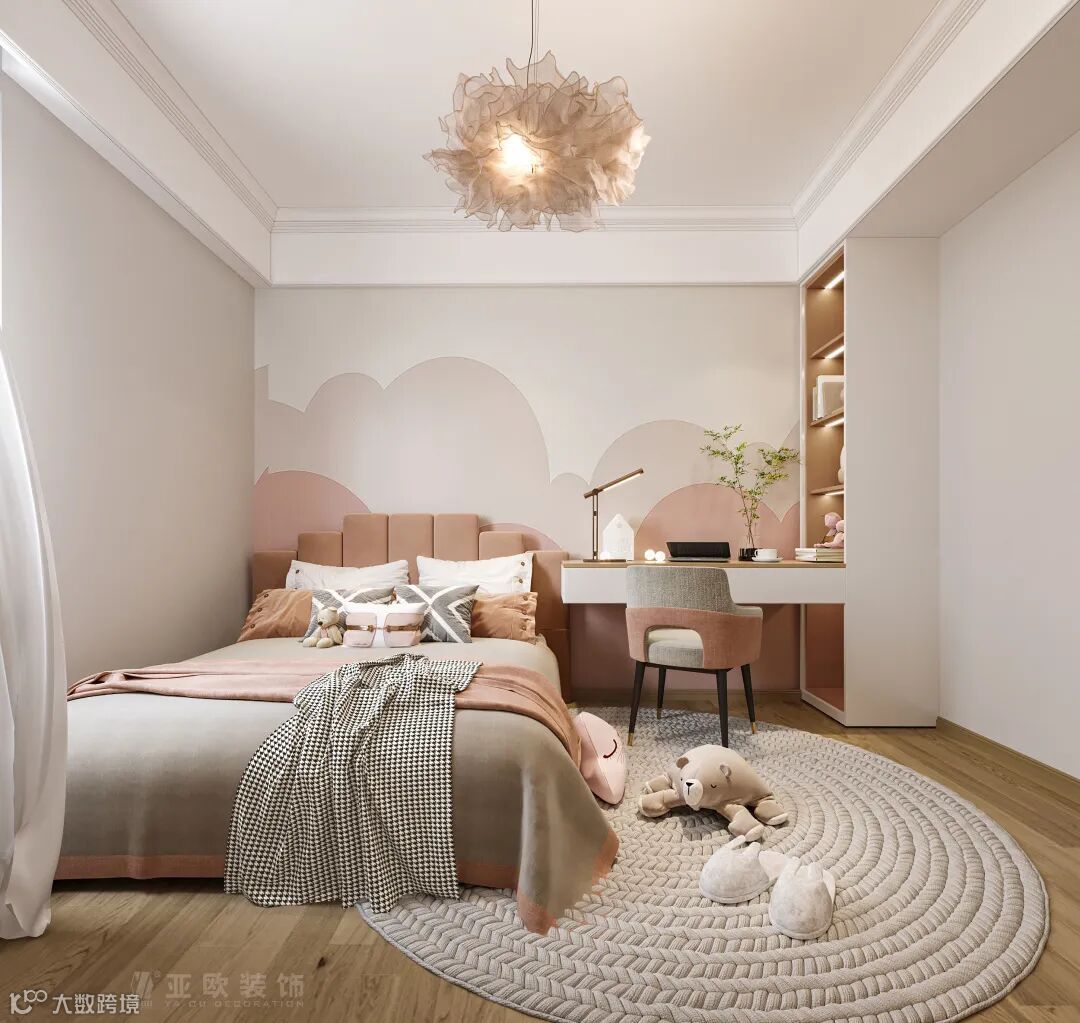 女儿房白色和粉色撞色,柔和的粉色为卧室增添了浪漫的气息,彰显空间的精致感。
