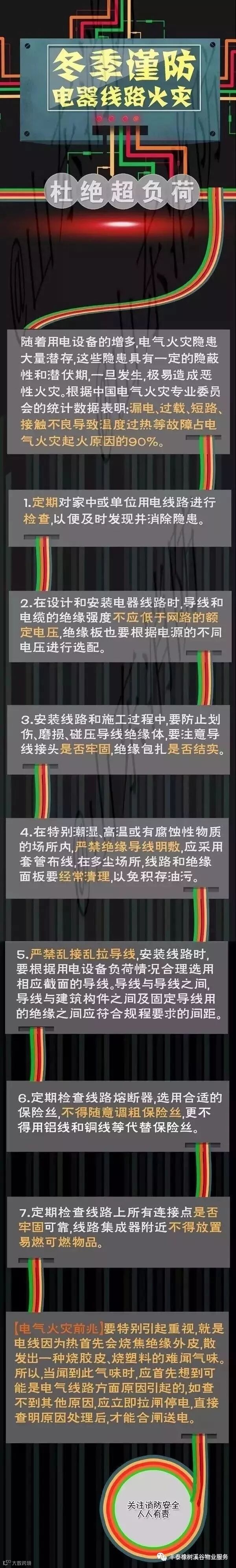 随着电气设备的增多,电气火灾隐患大量潜存,这些火灾隐患具有一定的隐蔽性和潜伏期,一旦发生,极易造成恶性火灾。尚峰桃园服务中心再次提醒大家定期检查电气线路,有老化破损的一定要及时更换!