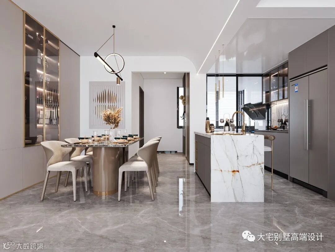 客厅的另一侧是开放式的厨房与餐厅,中岛台的设计既方便日常餐厨操作,也带来十足的高级质感,造型上以香槟色金属点缀,打造出更符合现代审美与生活习惯的就餐空间。