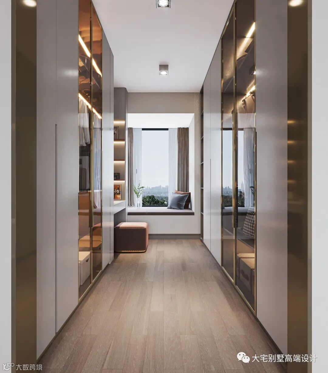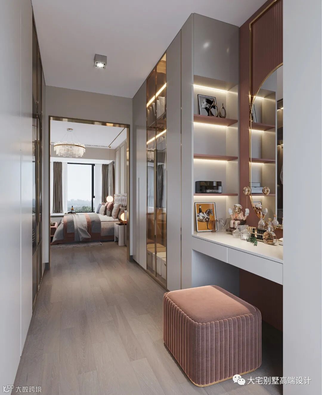 梳妆打扮的空间由衣帽间专门承担,与卧室相连,这个收纳需求极大的空间将装饰都藏于柜中,精致的半透明柜门、实用又美观的柜内灯,加上一个少女心十足的粉色梳妆台,让打扮自己的时光变得更有仪式感。