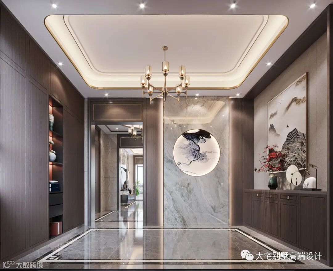玄关处,简洁大气的深棕色柜门收起杂乱,方正而通透,入户的空间典雅精致,避免了一进门就直面客厅的尴尬,保留了生活的隐私性,也让步入家门的时刻更具仪式感。