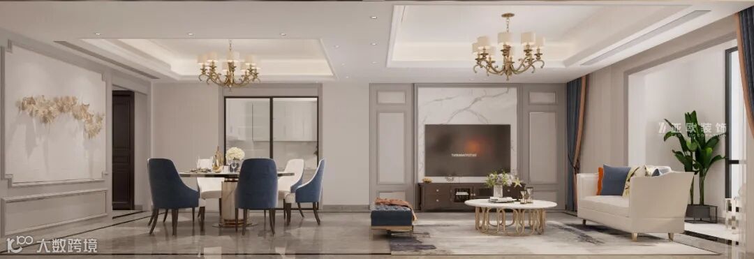客厅沙发背景墙没做复杂的造型,做了简单的边框修饰,然后在颜色上进行适当的搭配。客厅与阳台之间不做硬性隔断,提升了整个空间的通透感。
