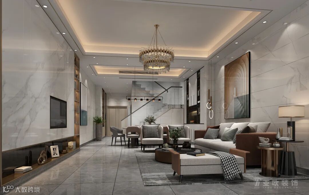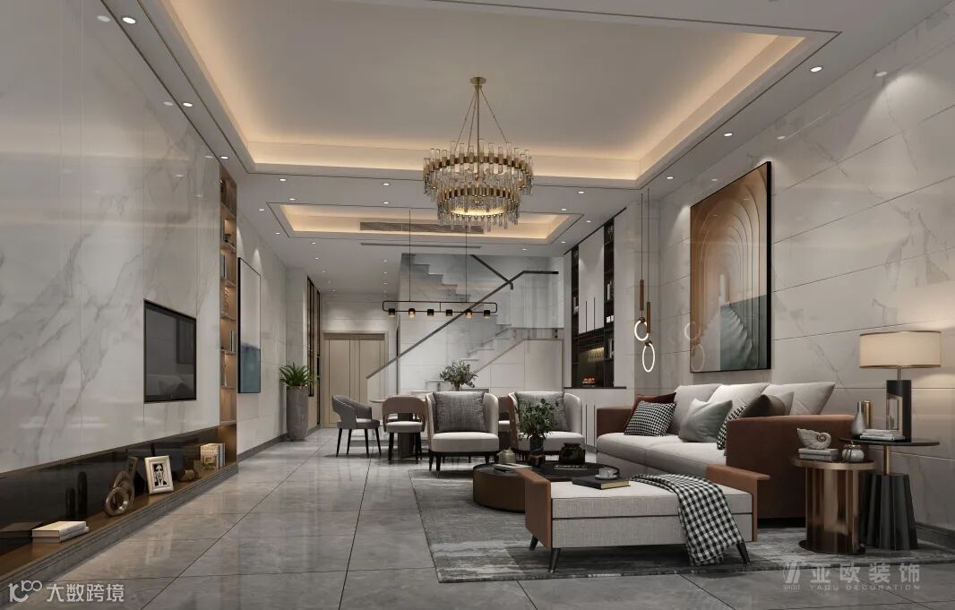 客厅高级灰与棕色的邂逅,造型优雅的别致沙发背景墙装饰,配合简约的吊灯,灯光顺着枝蔓倾洒而下,空间犹如披上了优雅浪漫的晚礼服。