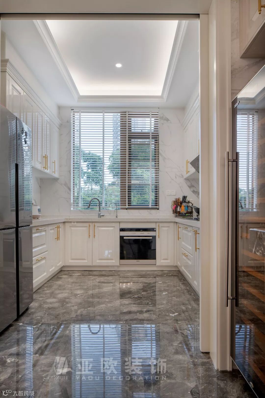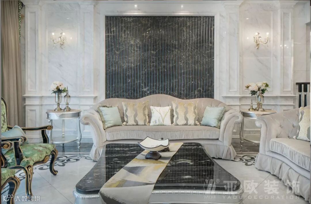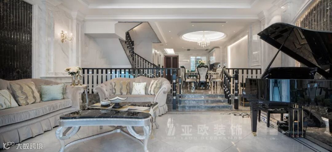 客餐厅利用原建筑的跃式结构,增加了不同空间的层次感。古典风格的沙发,搭配客厅的大理石背景墙,再放置一台钢琴,尽显美式风格的精致与优雅。