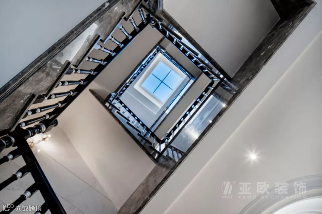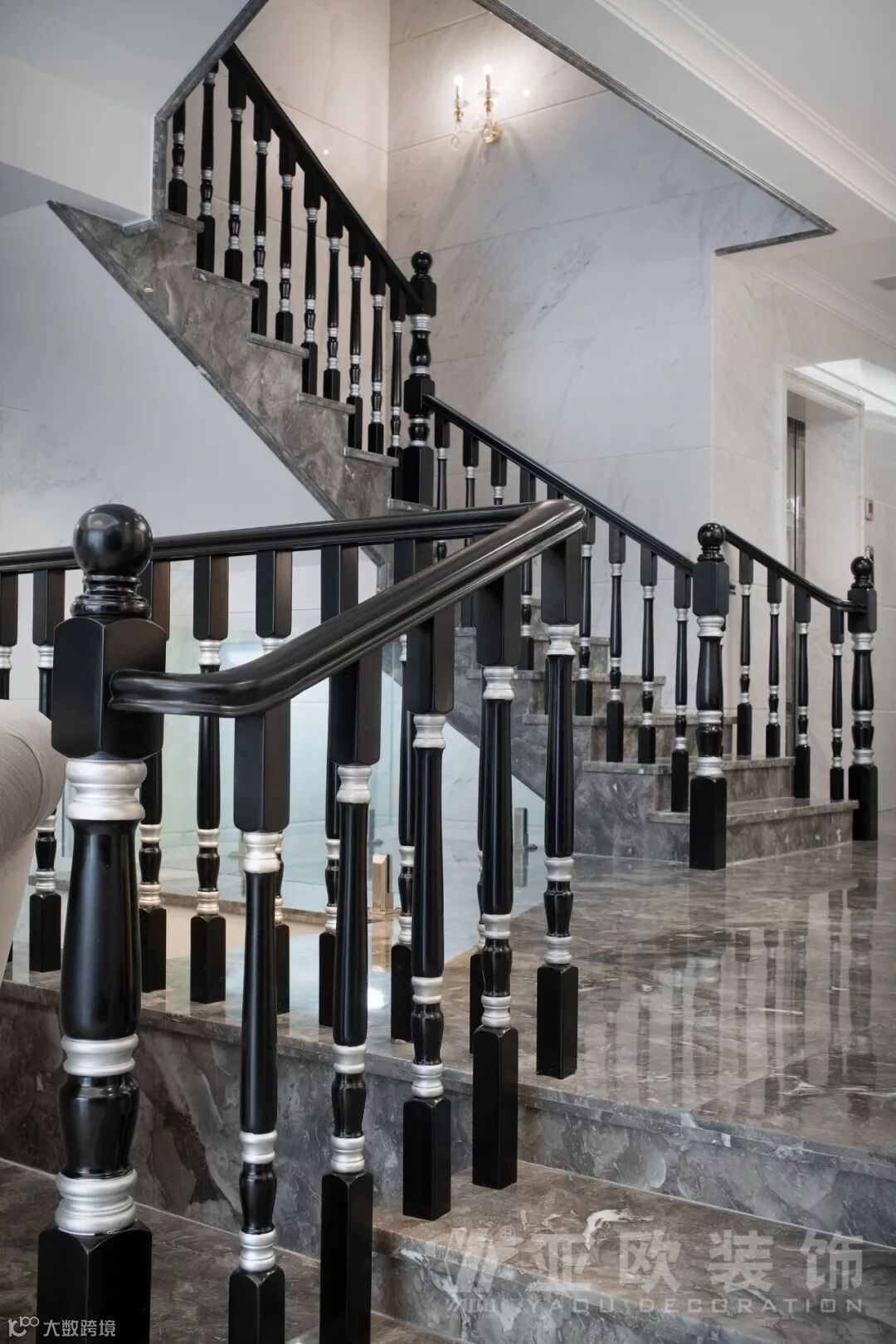 灰色的大理石台阶搭配黑白色的木质护栏,经典时尚。