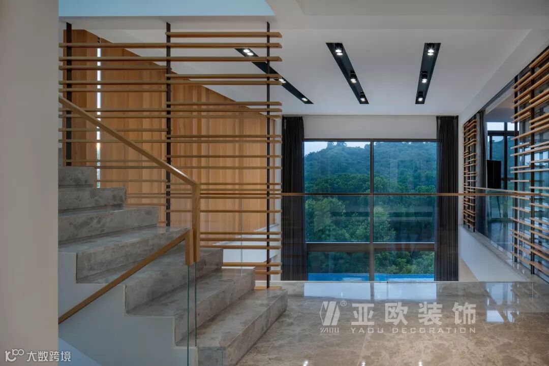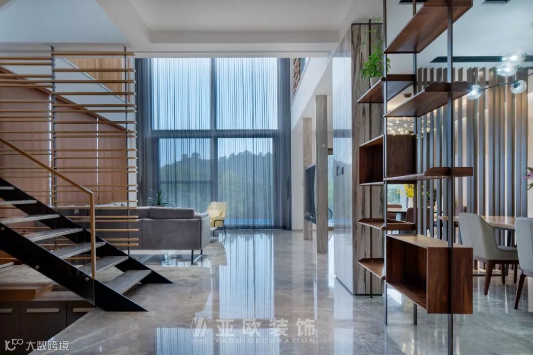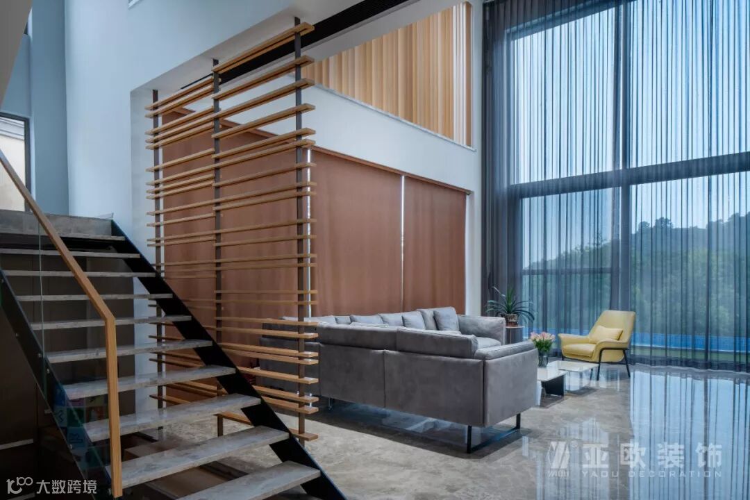 客厅用超大的落地窗把室外的景物融入进室内,不仅通透采光,还为客厅增添一幅大自然的画卷。钢架的楼梯不仅美观牢固,还为客厅增加一份空间的通透感。