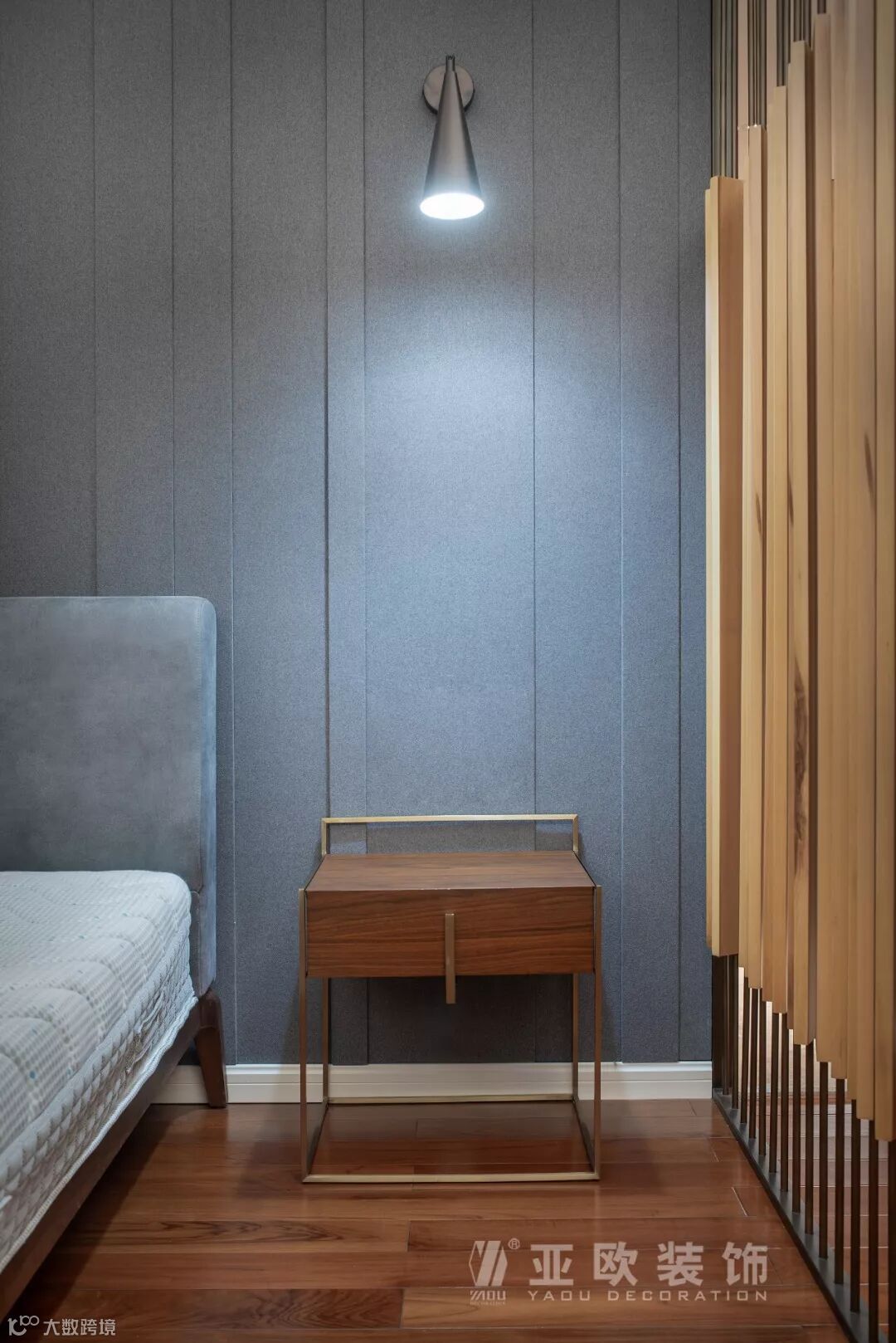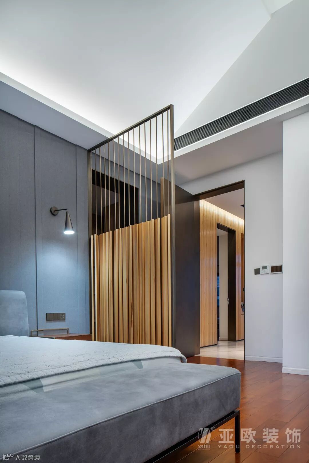 深灰色的硬包与地面木板相呼应,使得卧室沉稳、高雅。