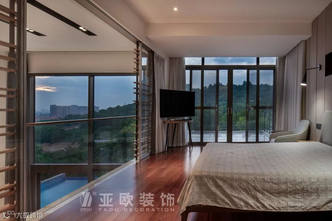 二楼卧室靠客厅原墙体打通,安装玻璃护栏及玻璃推拉门增加与客厅的互动性,并拥有开阔的视觉感和通透的空间感。美观时尚,营造出隔而不断的视觉美感。