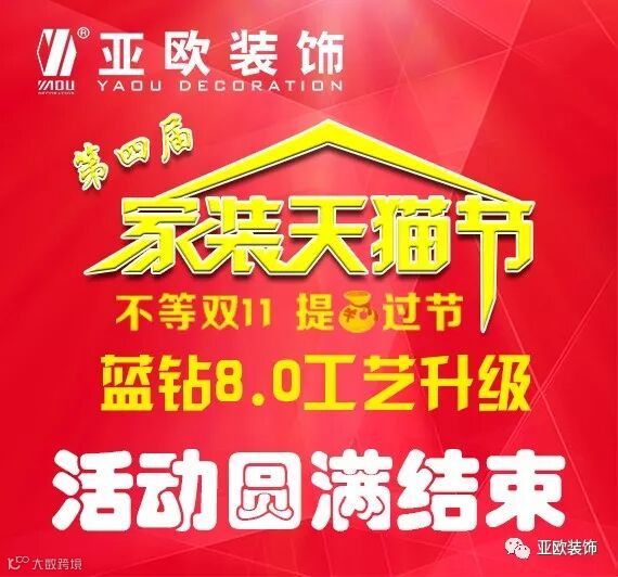 “第四届亚欧装饰家装天猫节”活动圆满落幕,感谢广大业主给予我们公司的支持与信任,感谢各大建材品牌商家对我们公司的鼎力支持与合作,同时也感谢亚欧家人们为打造中国最受欢迎的顶尖家装品牌做出的努力与贡献!