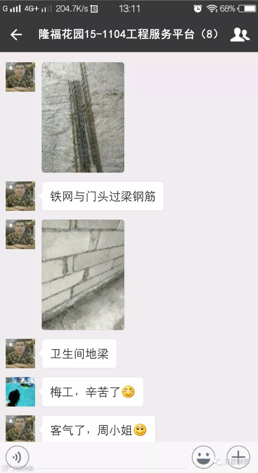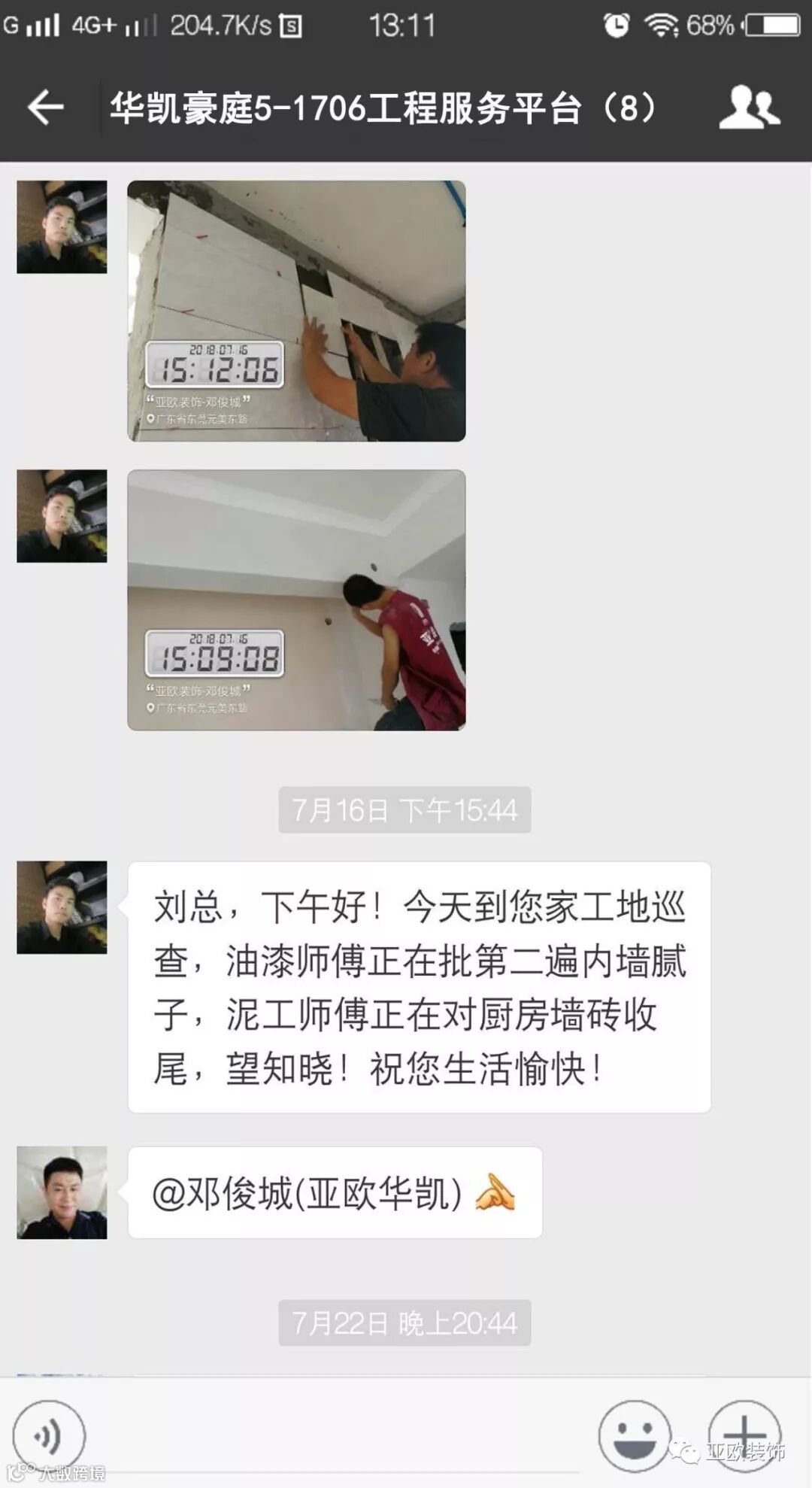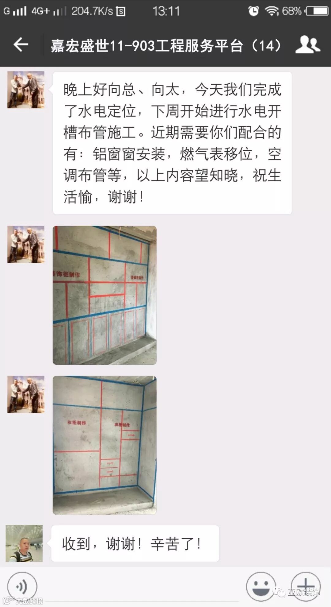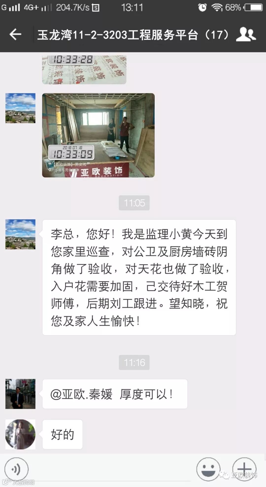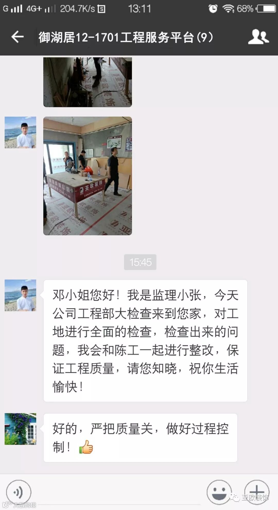 微信工地服务平台是公司基于微信软件开发的工地监控沟通服务平台,是亚欧装饰工程指挥中心在推行的“OS工程管理体系”中的重要组成部分之一,突破传统家装管理存在的弊端,解决了装修过程中施工材料、施工过程、施工节点验收不及时、不公开、不透明等业主朋友所担心的问题。每个项目在设计之初,就会组建一个微信服务群,各个部门都有同事参与,设计中所涉及到的设计、工程等问题都会有专业人士第一时间解答。项目开工之初,按照制度,各个层次的管理人员都会参与进来,个别工地甚至老板直接参与监督管理,全民皆兵,强化管理力度。项目开工后工程部会不定时的反馈施工过程中材料、过程、节点等验收水印图片,让施工过程管理及时、公开、透明,得到了业主朋友高度认可与好评。