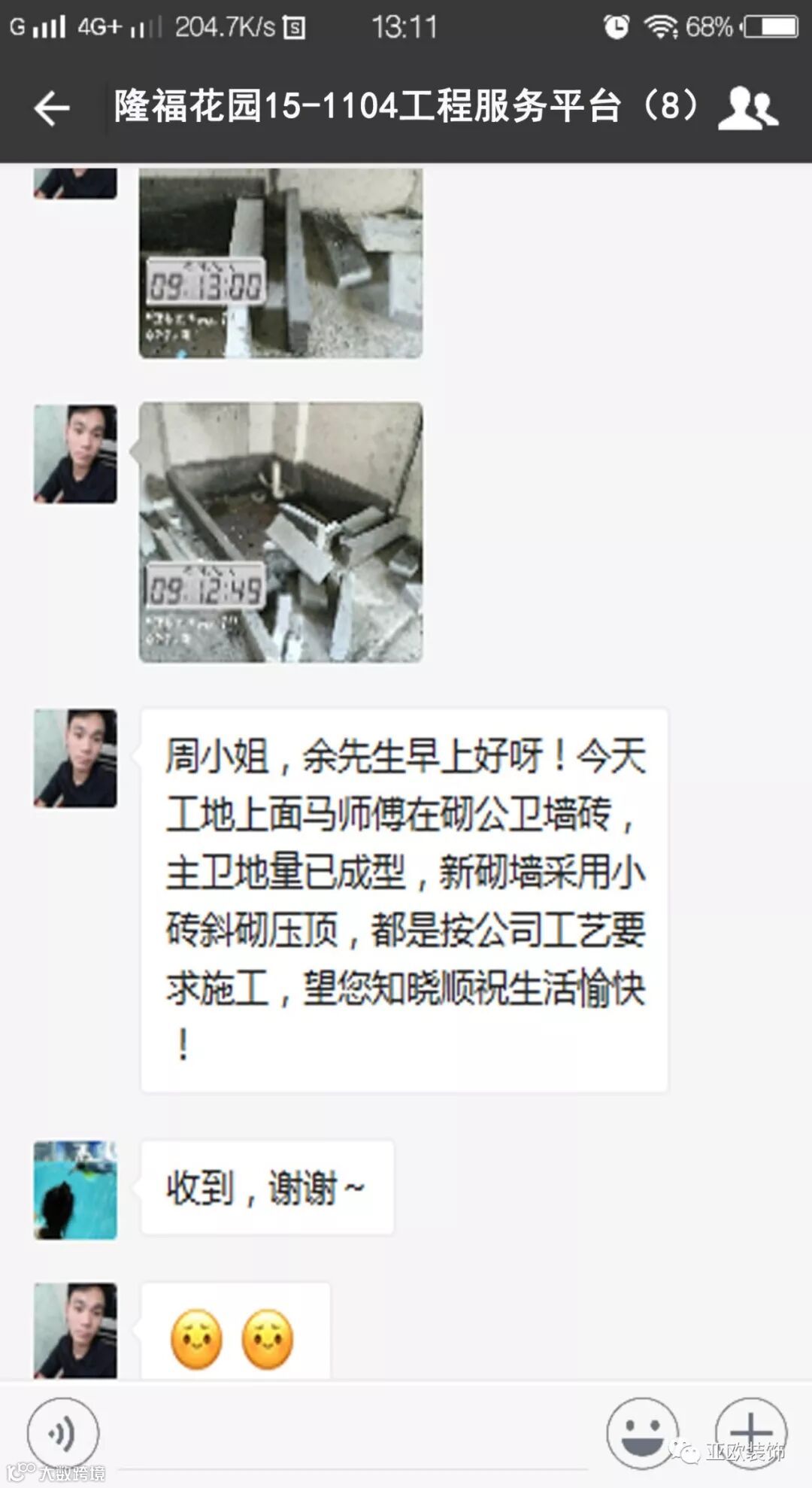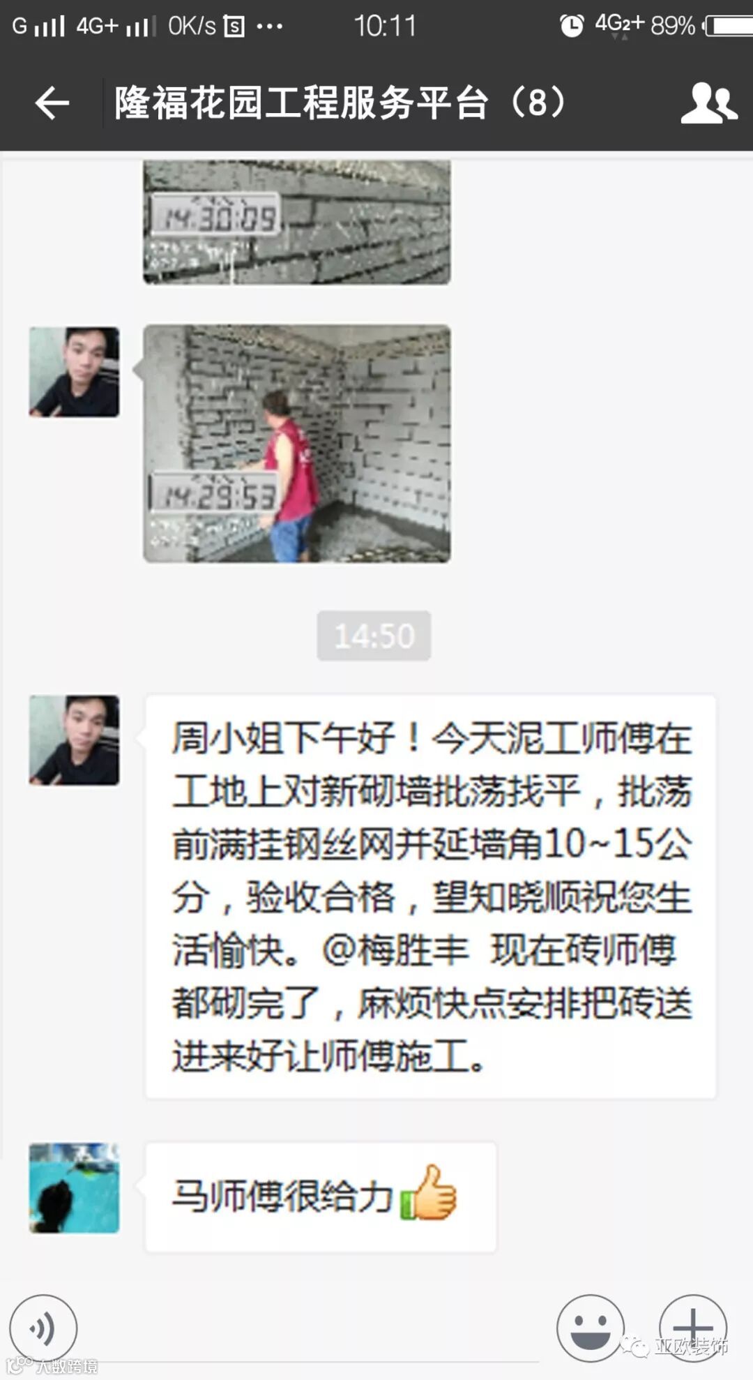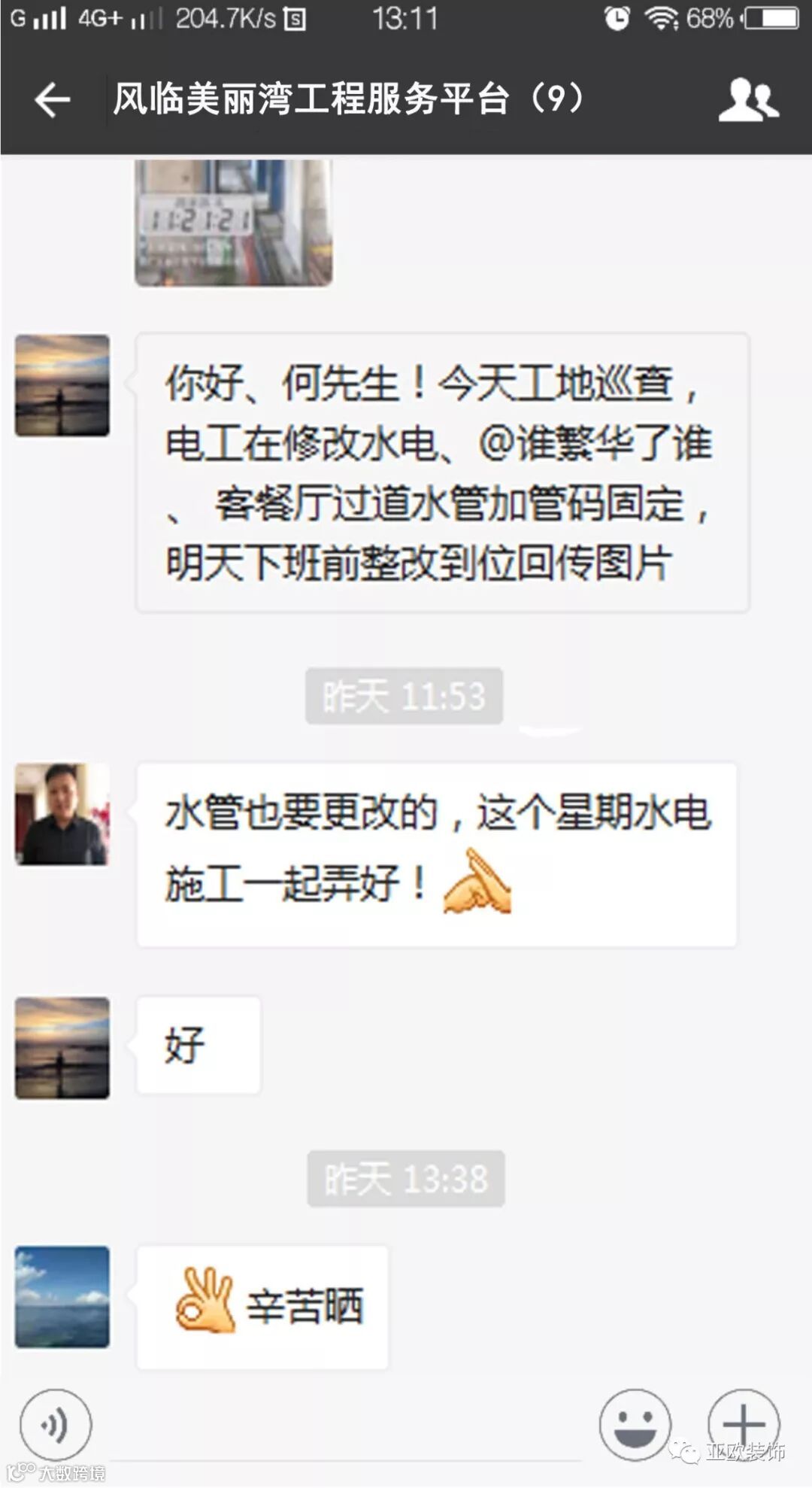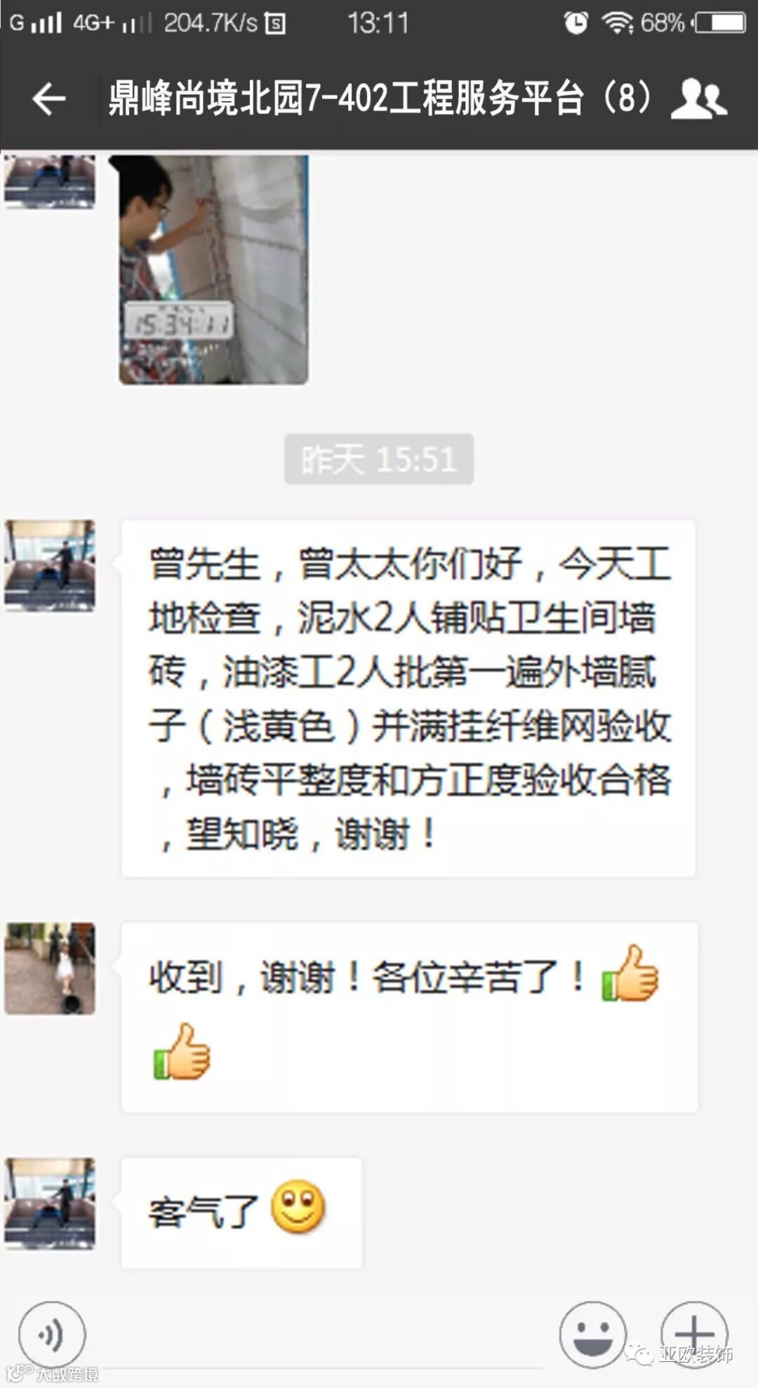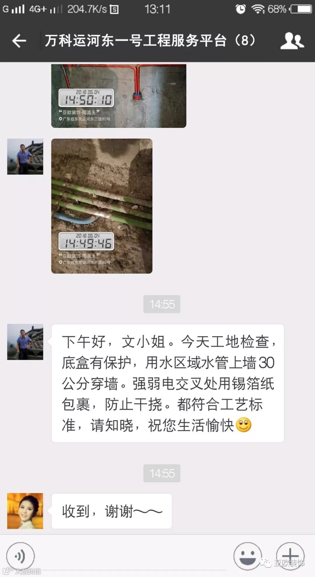 微信工地服务平台是公司基于微信软件开发的工地监控沟通服务平台,是亚欧装饰工程指挥中心在推行的“OS工程管理体系”中的重要组成部分之一,突破传统家装管理存在的弊端,解决了装修过程中施工材料、施工过程、施工节点验收不及时、不公开、不透明等业主朋友所担心的问题。每个项目在设计之初,就会组建一个微信服务群,各个部门都有同事参与,设计中所涉及到的设计、工程等问题都会有专业人士第一时间解答。项目开工之初,按照制度,各个层次的管理人员都会参与进来,个别工地甚至老板直接参与监督管理,全民皆兵,强化管理力度。项目开工后工程部会不定时的反馈施工过程中材料、过程、节点等验收水印图片,让施工过程管理及时、公开、透明,得到了业主朋友高度认可与好评。