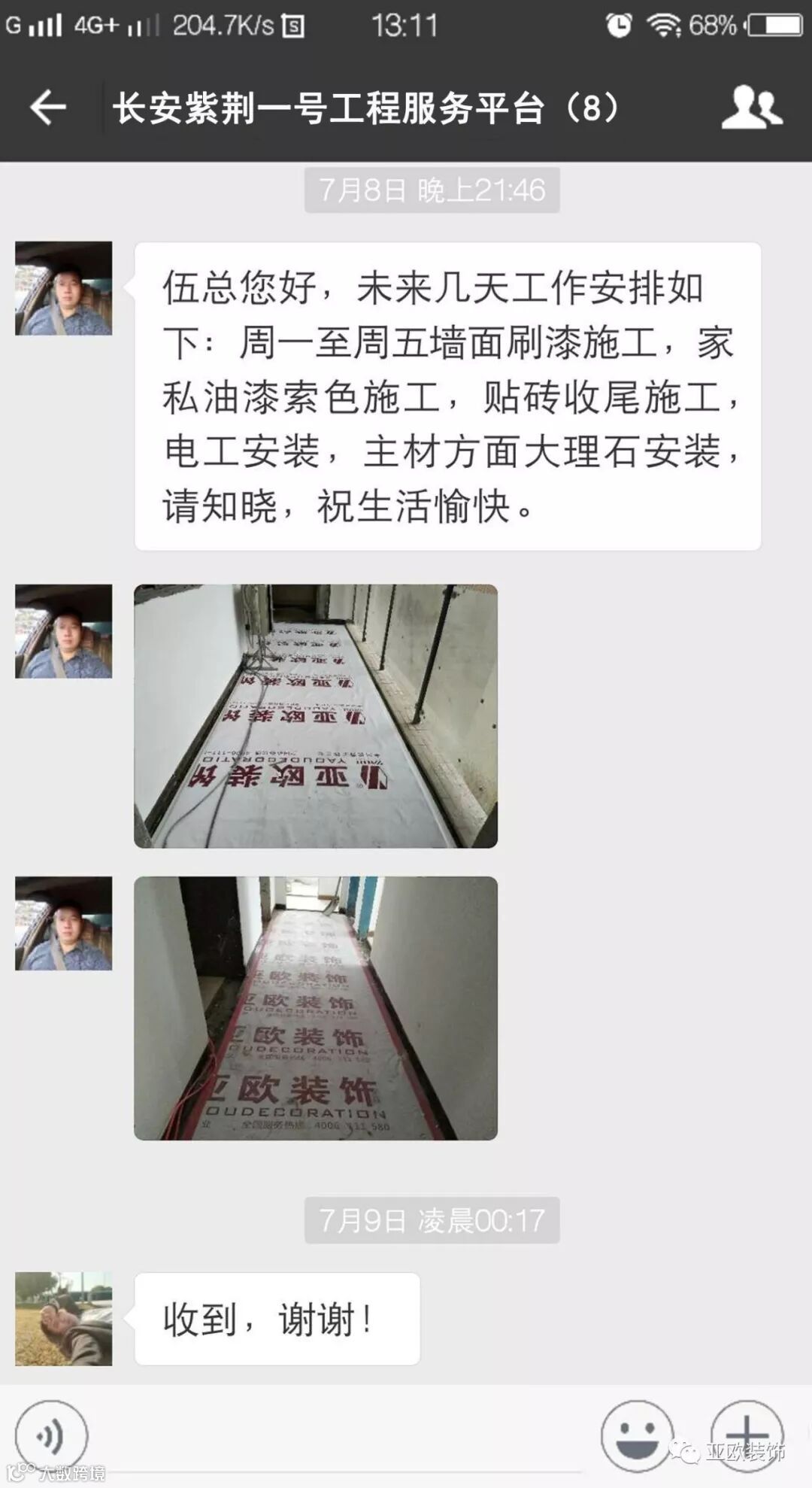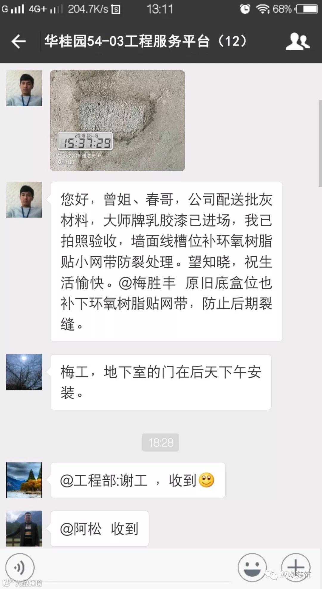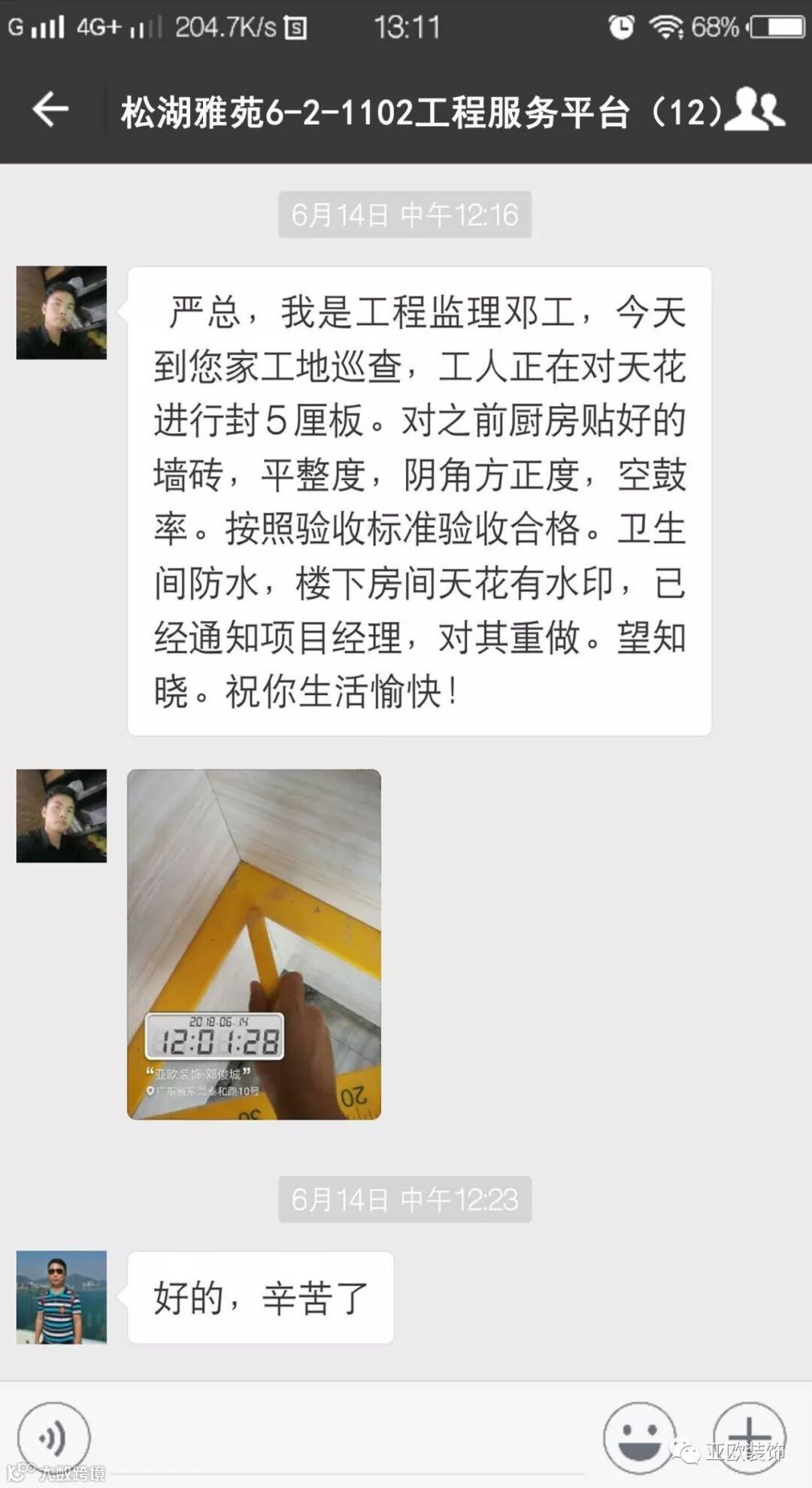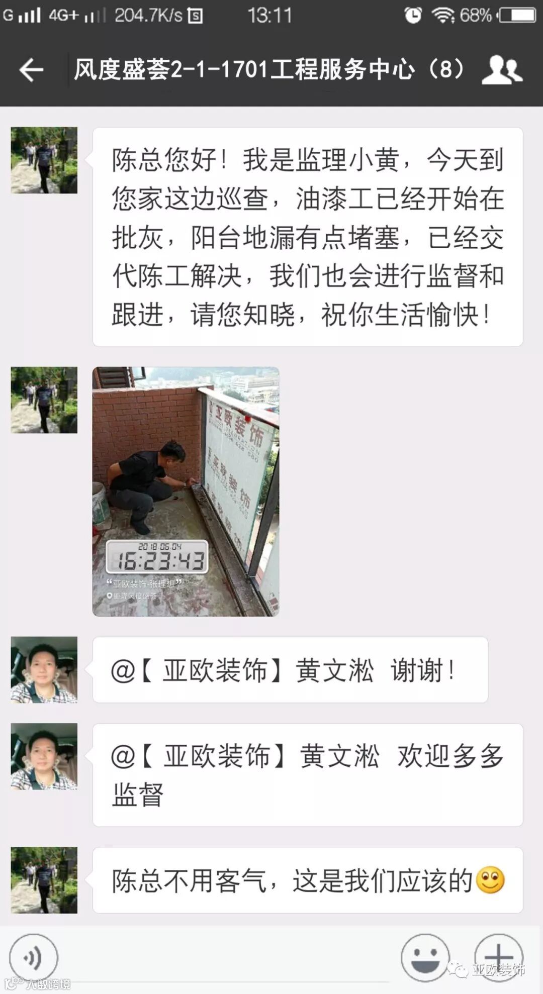 微信工地服务平台是公司基于微信软件开发的工地监控沟通服务平台,是亚欧装饰工程指挥中心在推行的“OS工程管理体系”中的重要组成部分之一,突破传统家装管理存在的弊端,解决了装修过程中施工材料、施工过程、施工节点验收不及时、不公开、不透明等业主朋友所担心的问题。每个项目在设计之初,就会组建一个微信服务群,各个部门都有同事参与,设计中所涉及到的设计、工程等问题都会有专业人士第一时间解答。项目开工之初,按照制度,各个层次的管理人员都会参与进来,个别工地甚至老板直接参与监督管理,全民皆兵,强化管理力度。项目开工后工程部会不定时的反馈施工过程中材料、过程、节点等验收水印图片,让施工过程管理及时、公开、透明,得到了业主朋友高度认可与好评。