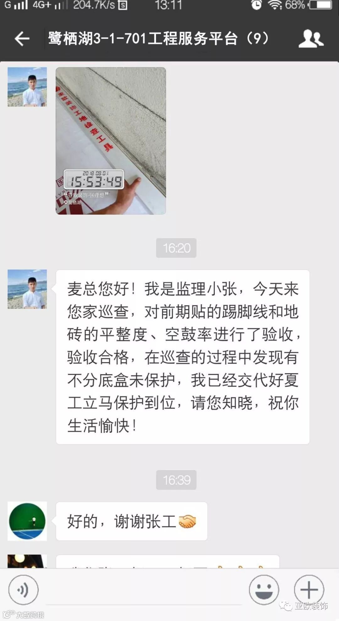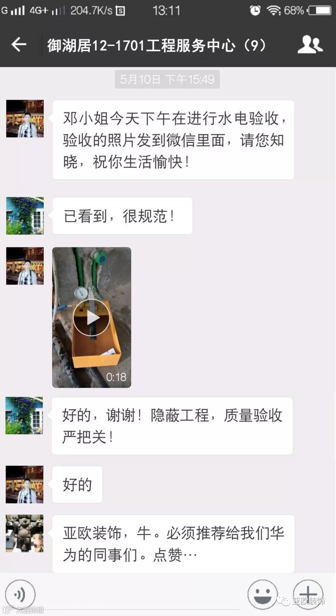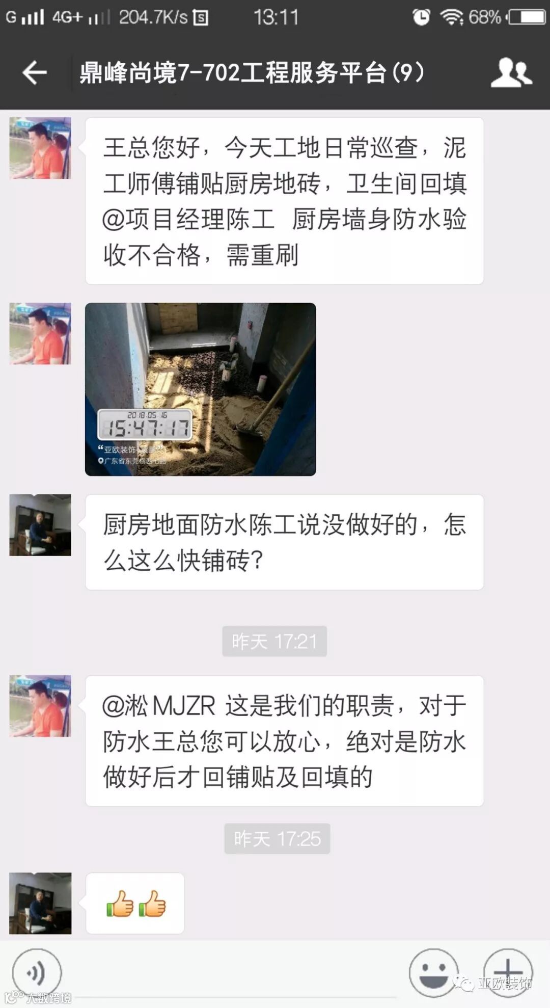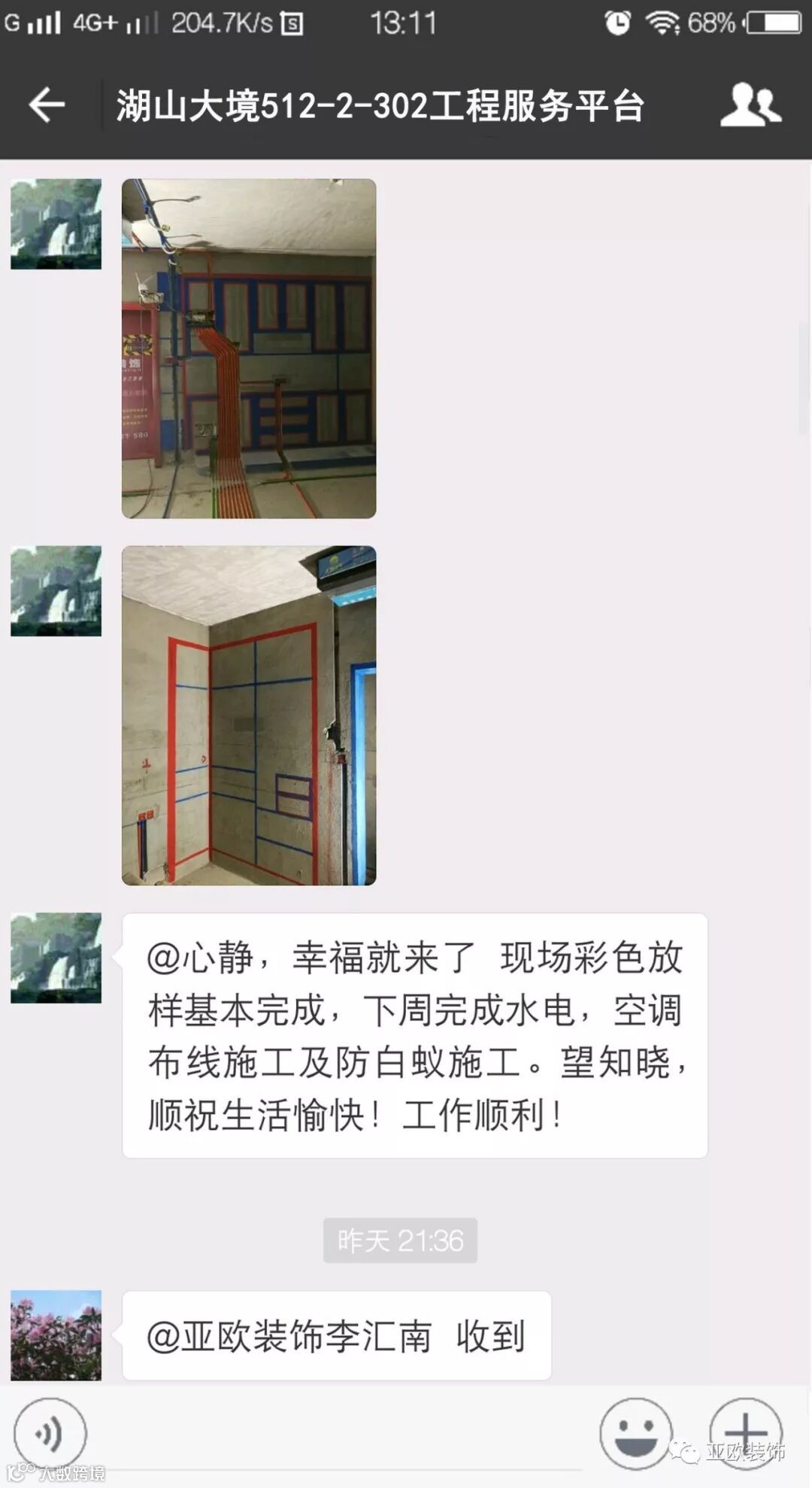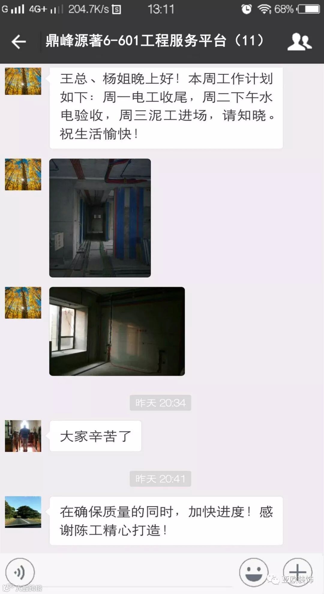 微信工地服务平台是公司基于微信软件开发的工地监控沟通服务平台,是亚欧装饰工程指挥中心在推行的“OS工程管理体系”中的重要组成部分之一,突破传统家装管理存在的弊端,解决了装修过程中施工材料、施工过程、施工节点验收不及时、不公开、不透明等业主朋友所担心的问题。每个项目在设计之初,就会组建一个微信服务群,各个部门都有同事参与,设计中所涉及到的设计、工程等问题都会有专业人士第一时间解答。项目开工之初,按照制度,各个层次的管理人员都会参与进来,个别工地甚至老板直接参与监督管理,全民皆兵,强化管理力度。项目开工后工程部会不定时的反馈施工过程中材料、过程、节点等验收水印图片,让施工过程管理及时、公开、透明,得到了业主朋友高度认可与好评。