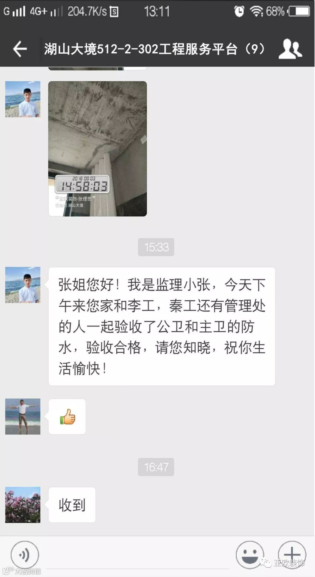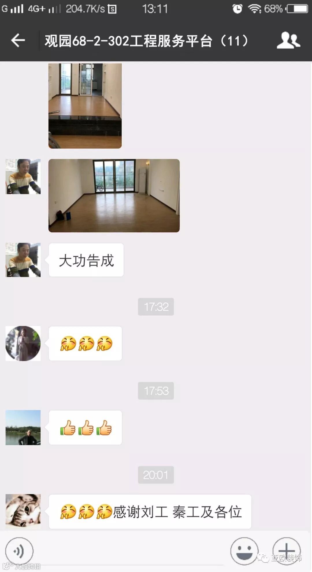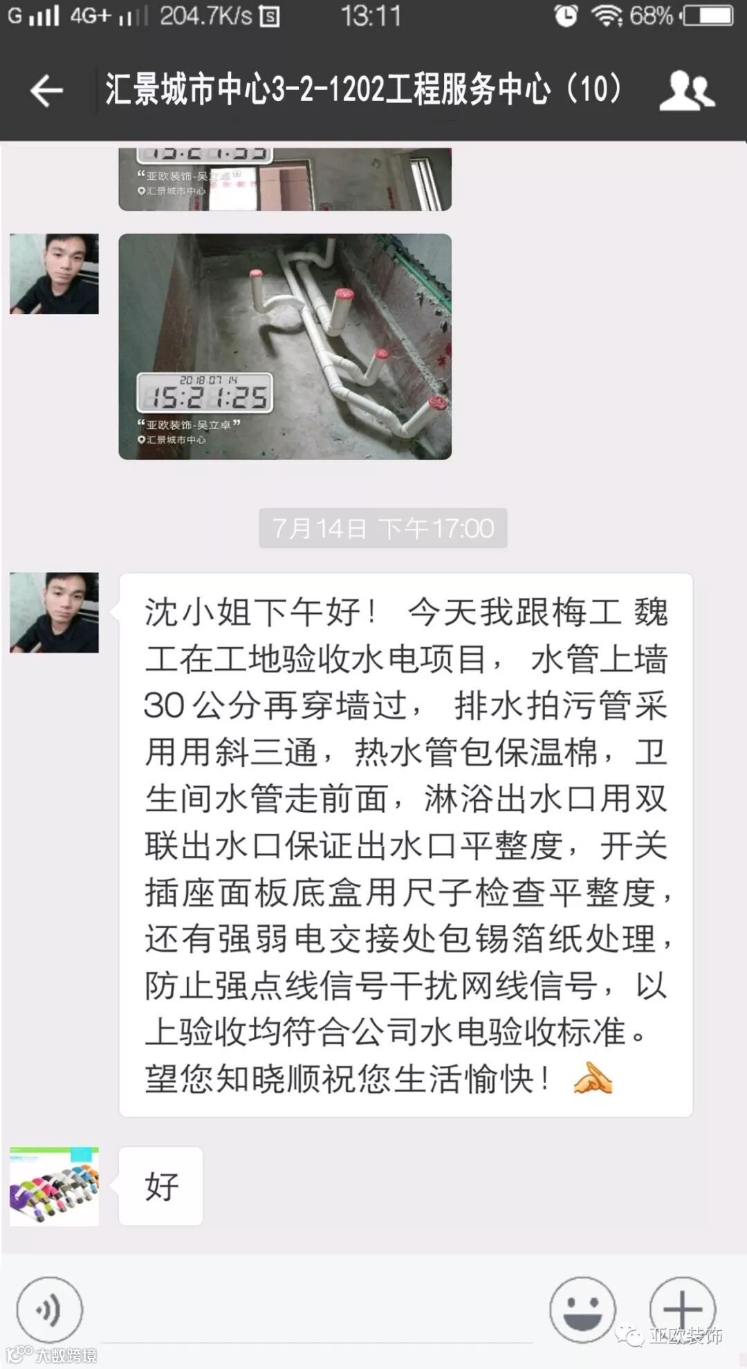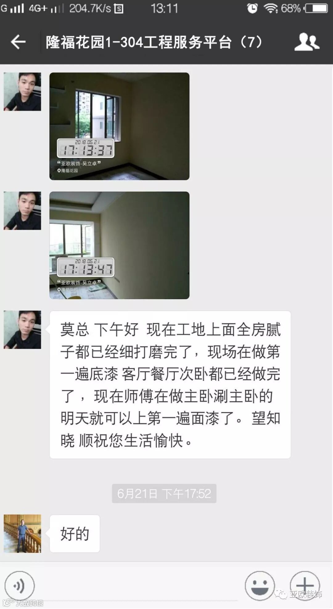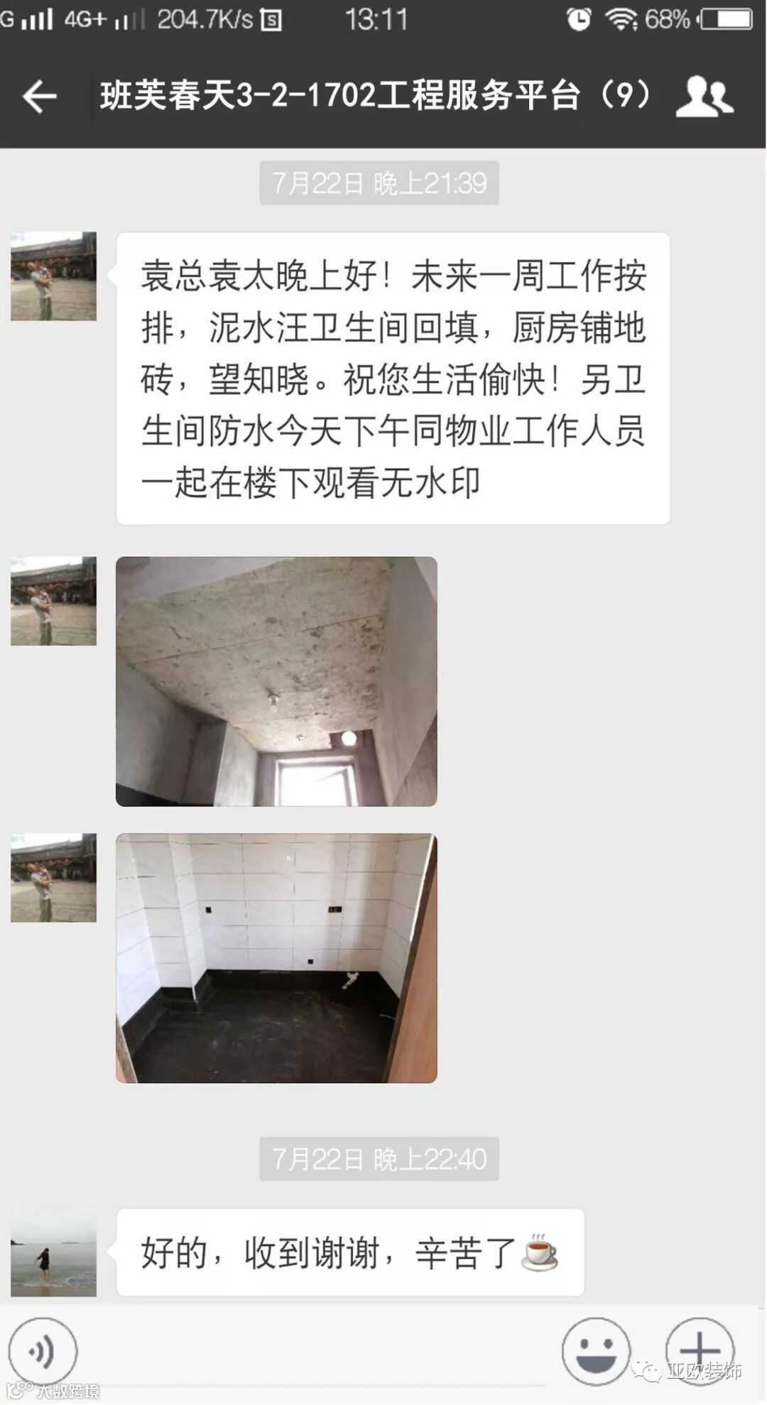 微信工地服务平台是公司基于微信软件开发的工地监控沟通服务平台,是亚欧装饰工程指挥中心在推行的“OS工程管理体系”中的重要组成部分之一,突破传统家装管理存在的弊端,解决了装修过程中施工材料、施工过程、施工节点验收不及时、不公开、不透明等业主朋友所担心的问题。每个项目在设计之初,就会组建一个微信服务群,各个部门都有同事参与,设计中所涉及到的设计、工程等问题都会有专业人士第一时间解答。项目开工之初,按照制度,各个层次的管理人员都会参与进来,个别工地甚至老板直接参与监督管理,全民皆兵,强化管理力度。项目开工后工程部会不定时的反馈施工过程中材料、过程、节点等验收水印图片,让施工过程管理及时、公开、透明,得到了业主朋友高度认可与好评。