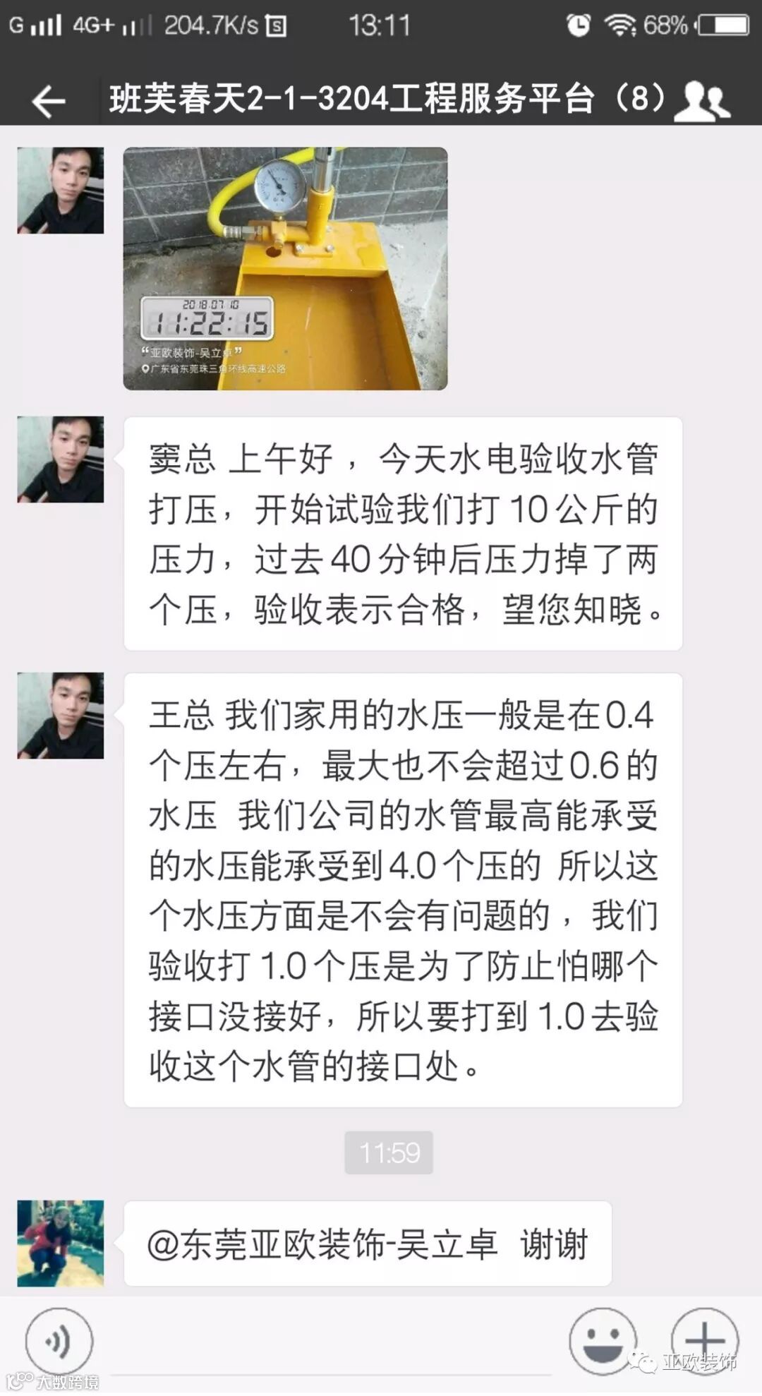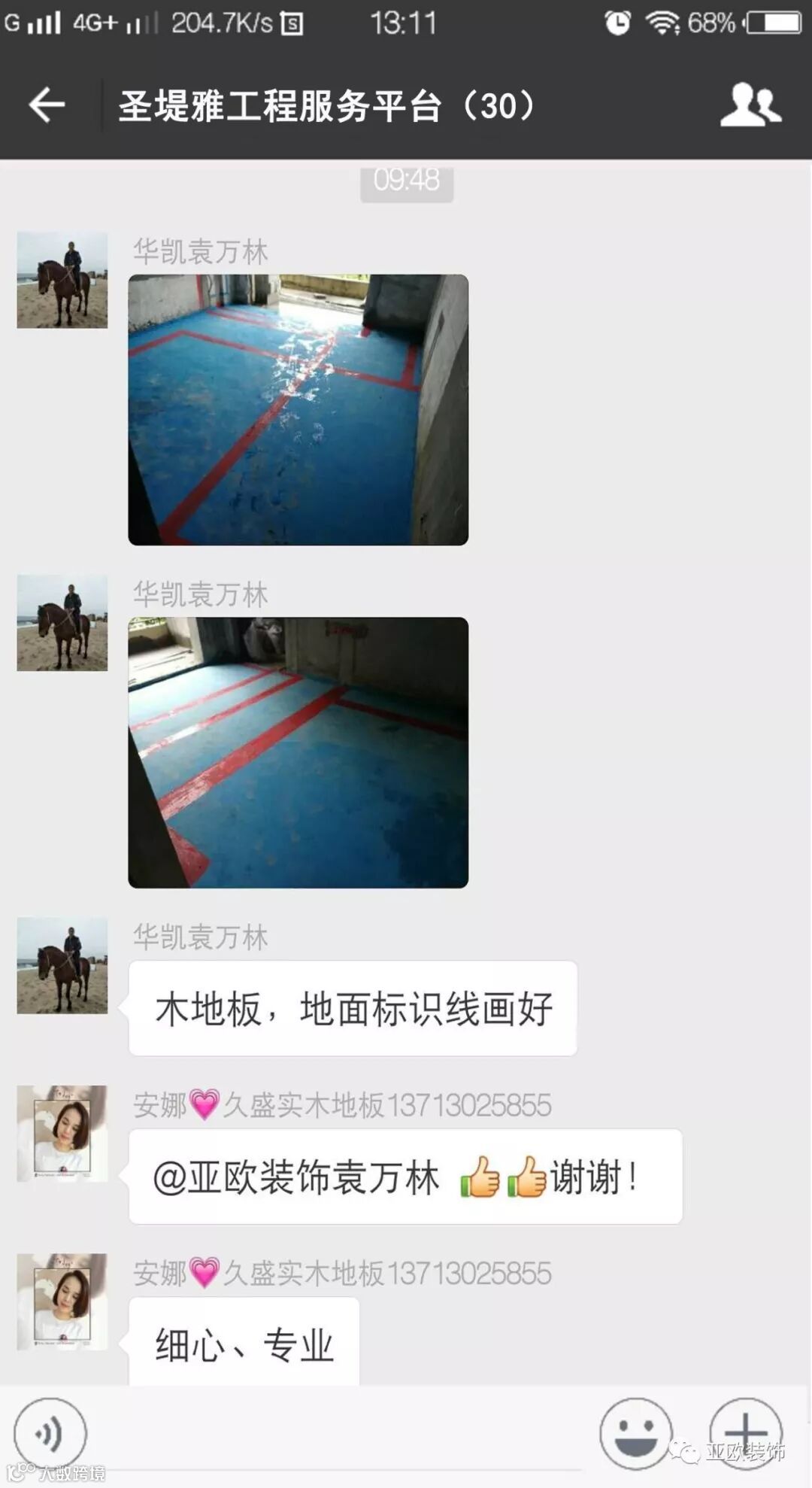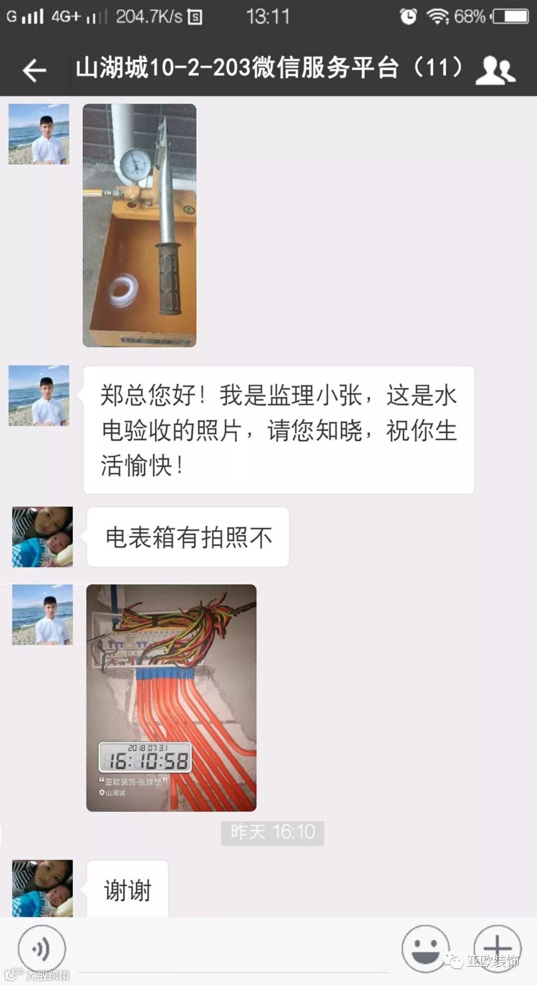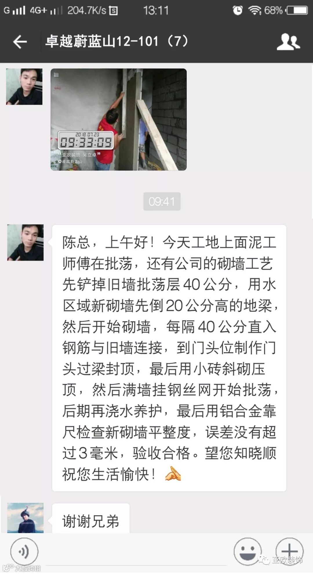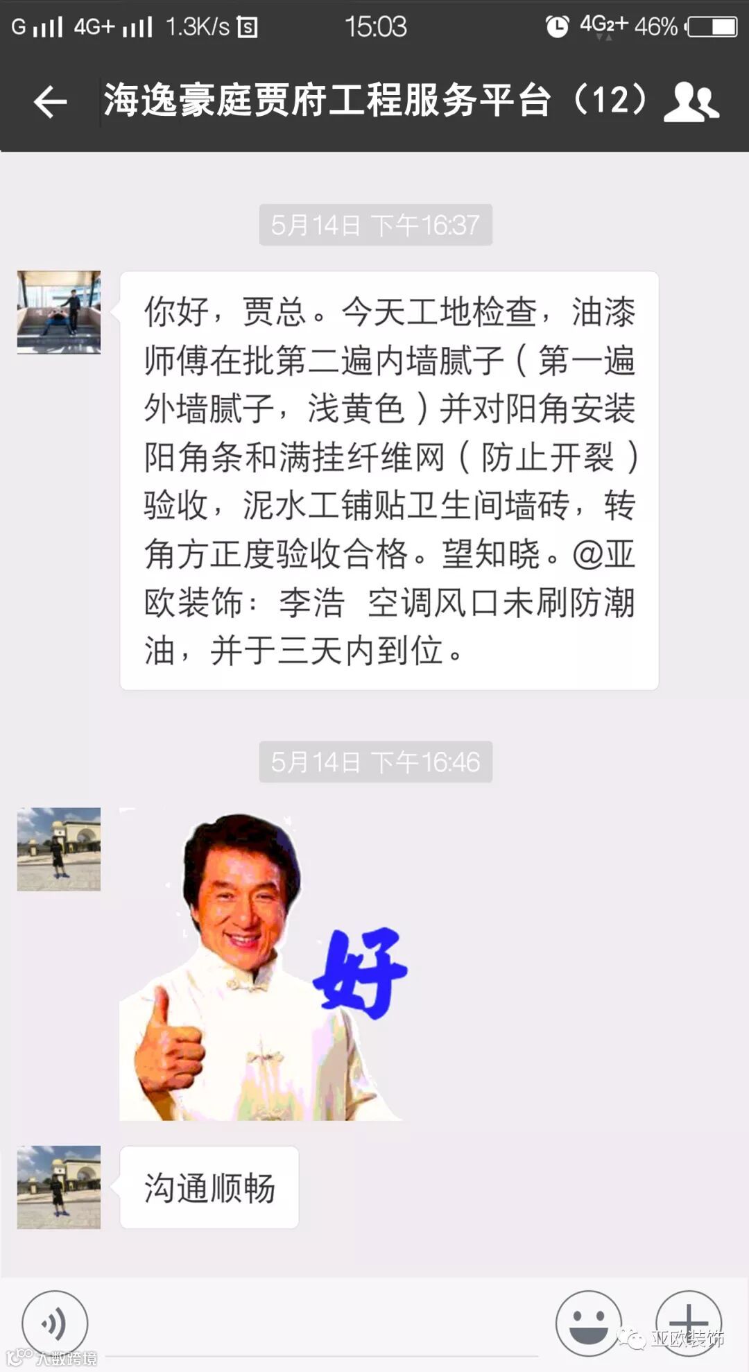 微信工地服务平台是公司基于微信软件开发的工地监控沟通服务平台,是亚欧装饰工程指挥中心在推行的“OS工程管理体系”中的重要组成部分之一,突破传统家装管理存在的弊端,解决了装修过程中施工材料、施工过程、施工节点验收不及时、不公开、不透明等业主朋友所担心的问题。每个项目在设计之初,就会组建一个微信服务群,各个部门都有同事参与,设计中所涉及到的设计、工程等问题都会有专业人士第一时间解答。项目开工之初,按照制度,各个层次的管理人员都会参与进来,个别工地甚至老板直接参与监督管理,全民皆兵,强化管理力度。项目开工后工程部会不定时的反馈施工过程中材料、过程、节点等验收水印图片,让施工过程管理及时、公开、透明,得到了业主朋友高度认可与好评。
