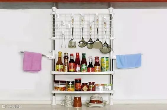 厨房的的小物品,可能要经常用到,桌子的空间已经占满了,又不想整天翻来翻去,那该怎么办呢?这时你可以考虑下墙的位置,在上面挂上一个置物架。