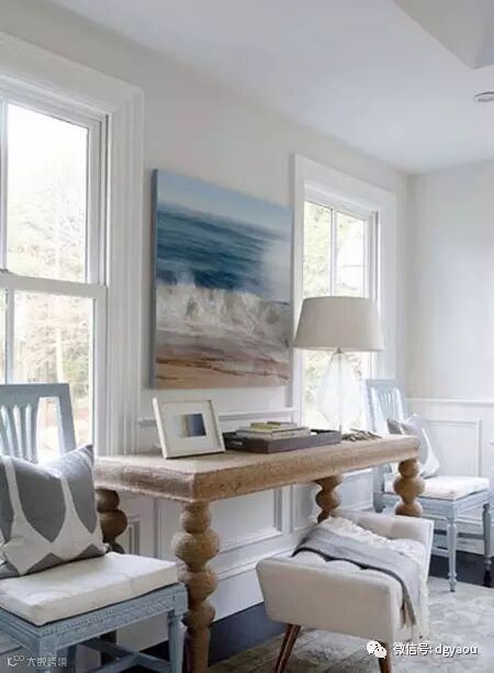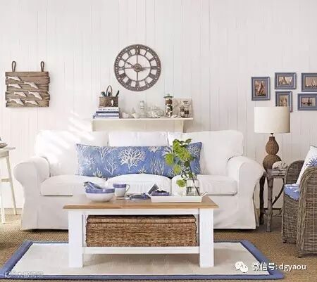 小编认为:蓝色是地中海风格必不可少的元素,无论是整体的家居基调还是点缀其间的零星装饰只要多点蓝色就能很好的渲染出地中海的气息。米色的沙发和毛绒的地毯在清爽的蓝色上添加了不少典雅感。