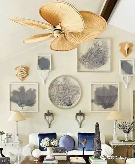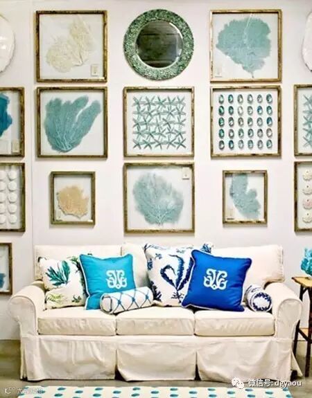 小编认为:各种各样样的海洋生物标本是背景墙上的亮点,也是吸引目光的所在。布艺沙发上淡蓝和深蓝相间的抱枕装饰着整个素淡空间。