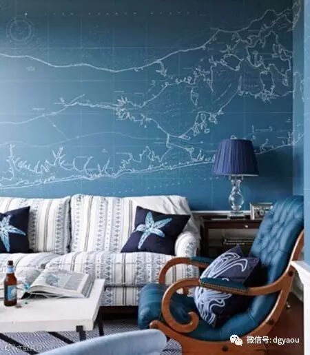 小编认为:整个背景墙都是蓝色,其上绘制着非常辽阔的海洋地图样式,让这样的地中海风格变得更加的名副其实。一旁的木制深蓝色表面单人椅是客厅中为数不多的其他色调,起到了很好的点缀作用。