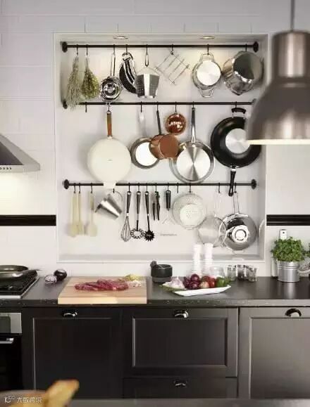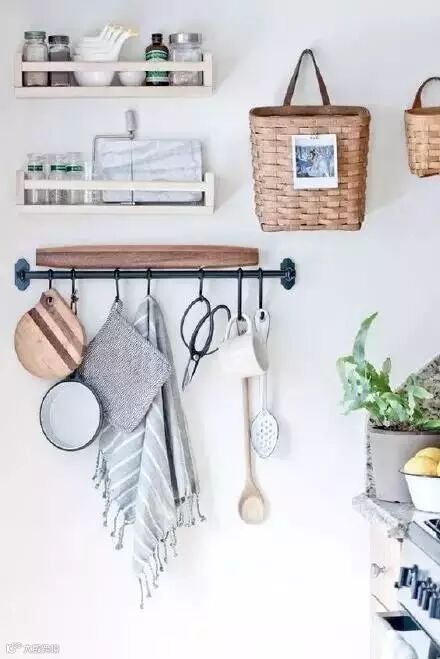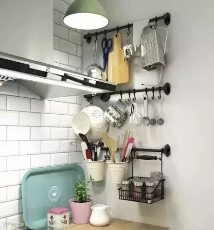 最讨厌的空间就是厨房是不是?脏、乱,还油腻!no!no!那是你家。将台面收拾干净整洁,墙面利用挂钩、置物架、挂杆等做好收纳,远远看去,厨房焕然一新!