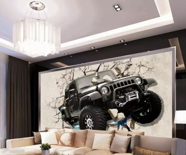 一辆仿佛正要跃墙而出的越野车,炫酷的车型,奢华的亮黑,体现着主人勇于探险、喜欢探险的精神。将这样一张壁纸放在客厅,一进门就能轻易吸引住别人的目光,赞叹主人家的好品味,荡漾出激昂的探险精神!