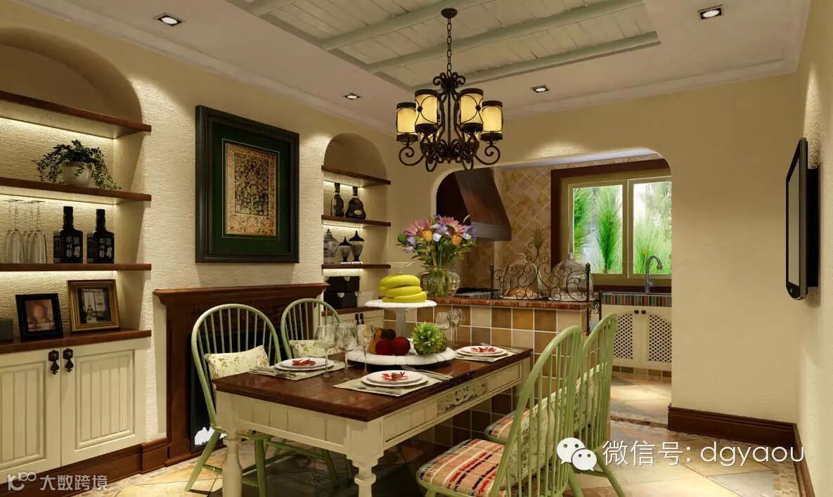 3、回转空间要足够。餐桌椅在开放式厨房间的摆放,不能影响烹饪操作空间,当餐椅拉出时,椅背距橱柜要在1米以上,而一般的餐桌椅至少要占2米的宽度,再加上橱柜的进深,就要求厨房长或宽的一边至少在3.6米以上。