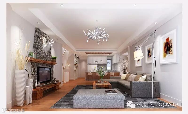 电视墙:休闲田园的壁炉设计配搭木材,鹿头装饰,材质方面运用浅色明亮的文化石和肌理漆的搭配,作为整个客厅的主角,体现主人对休闲田园阳光的居家环境的追求和生活态度。
