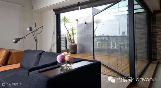 客厅有落地灯增强照明。旁边连接着一个宽大的露台,推开巨大的玻璃门,便能鸟瞰到这座繁华都市壮丽的风景。