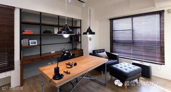 书房摆放着木质书桌和皮质沙发,沙发放置在窗旁,工作、休息两不误。简约的书桌背后的木架提供了充足的收纳空间。