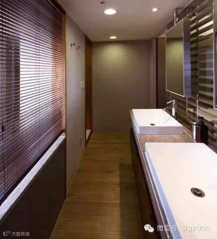 时尚的卫浴设计,根据其空间形状修长的特征,可以放置两个面盆。百叶窗既能保护空间的隐私,还具备良好的通透性。