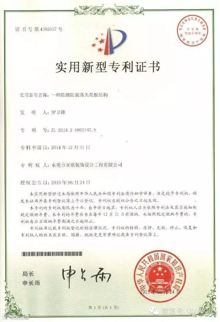 热烈祝贺亚欧装饰新发明的“一种防潮防脱落天花板结构”正式通过国家专利局审核,这是亚欧装饰继:“一种下沉式卫生间防水防臭沉降池结构”、“工程实景验收监控系统”后,为家装行业的发展作出的又一项重大突破!