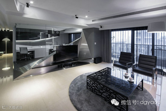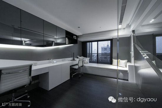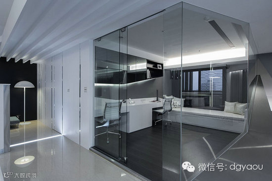 除了顺着不锈钢电视墙线条而变化的清玻隔间外,书房内的桌面与柜体亦与之呼应斜切呈现。